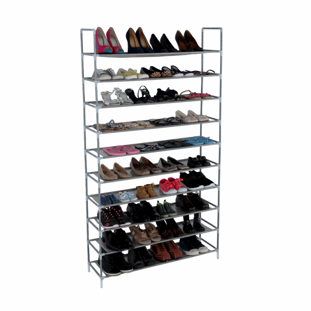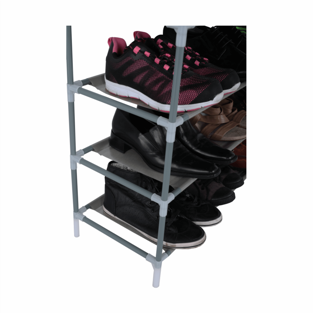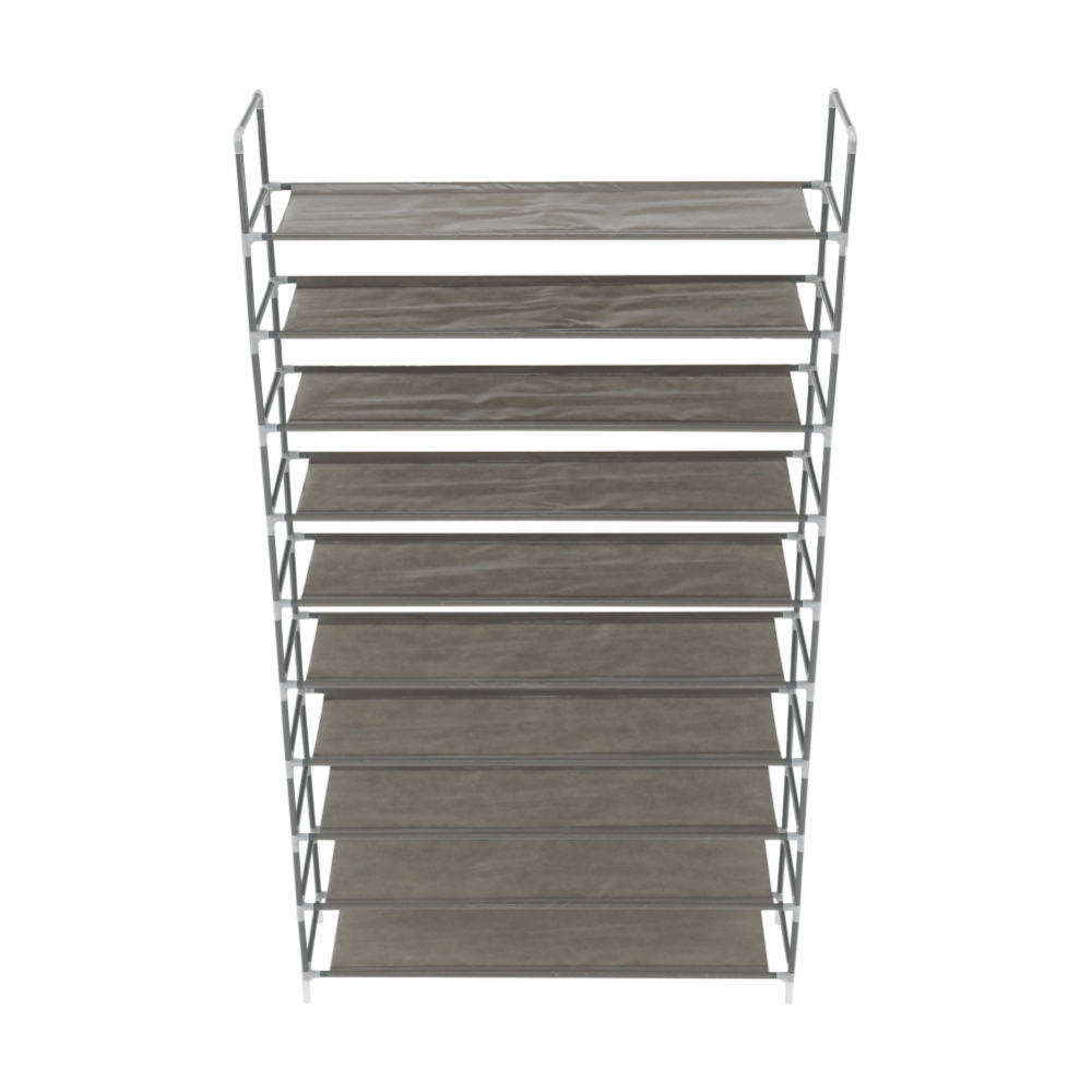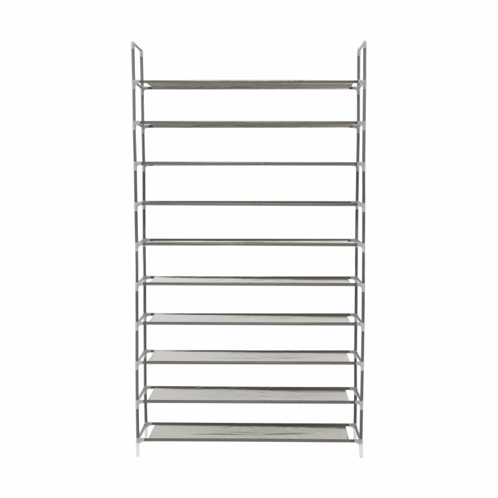 Materiál: kov / látka Barva: šedá Rozměry (ŠxHxV): 100x27x175 cm Nosnost: 30 kg 10-řadový botník Vhodný pro 50 párů bot. Dodávané v demontu.