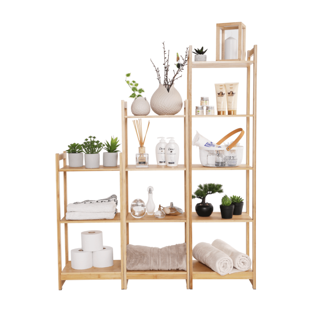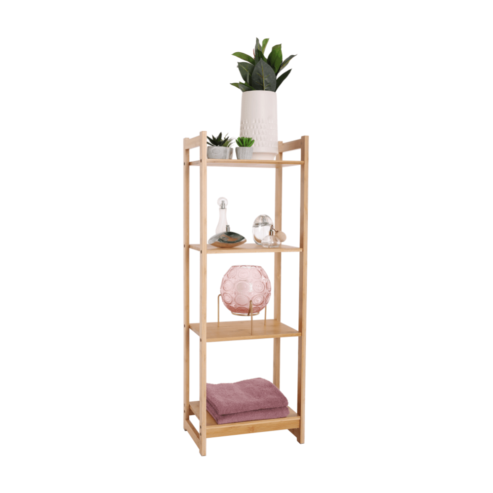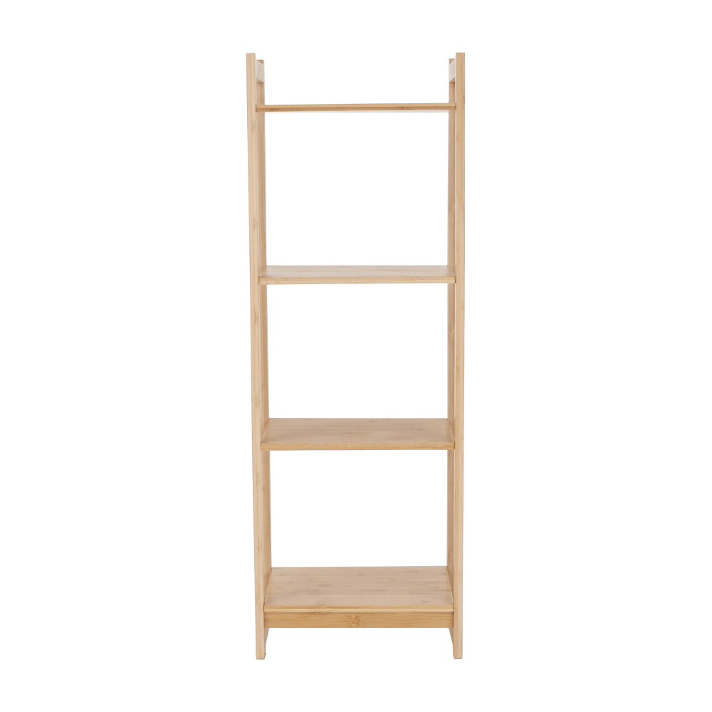 Materiál: lakovaný bambus Barva: přírodní Rozměr (ŠxHxV): 35x25x100,3 cm Vnitřní rozměry poličky (ŠXHxV): 32x19x26,5 cm 4-policový čtyři poličky Víceúčelový Dodávané v demontu