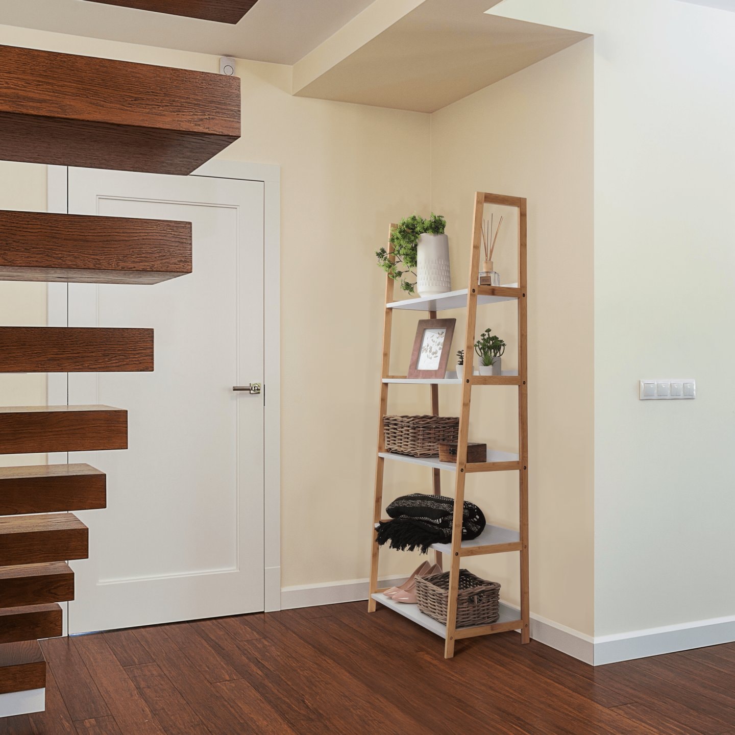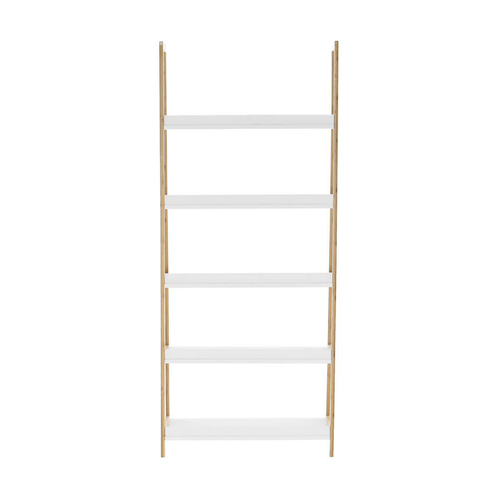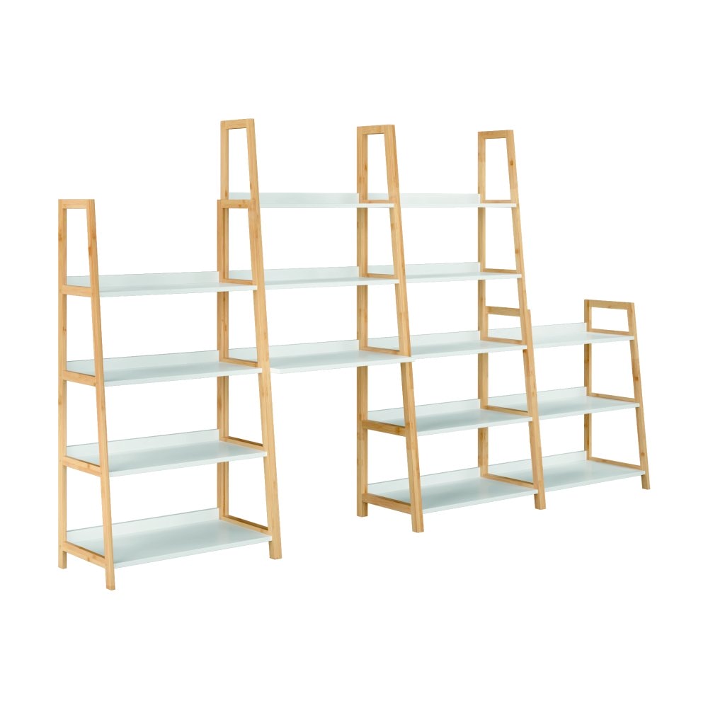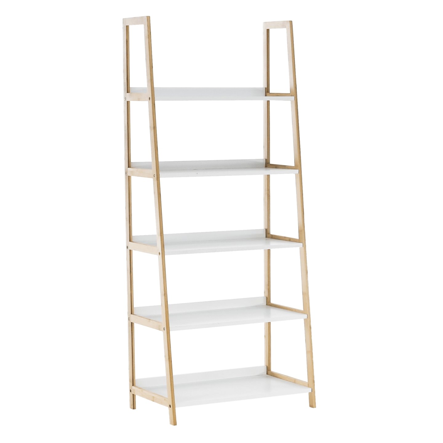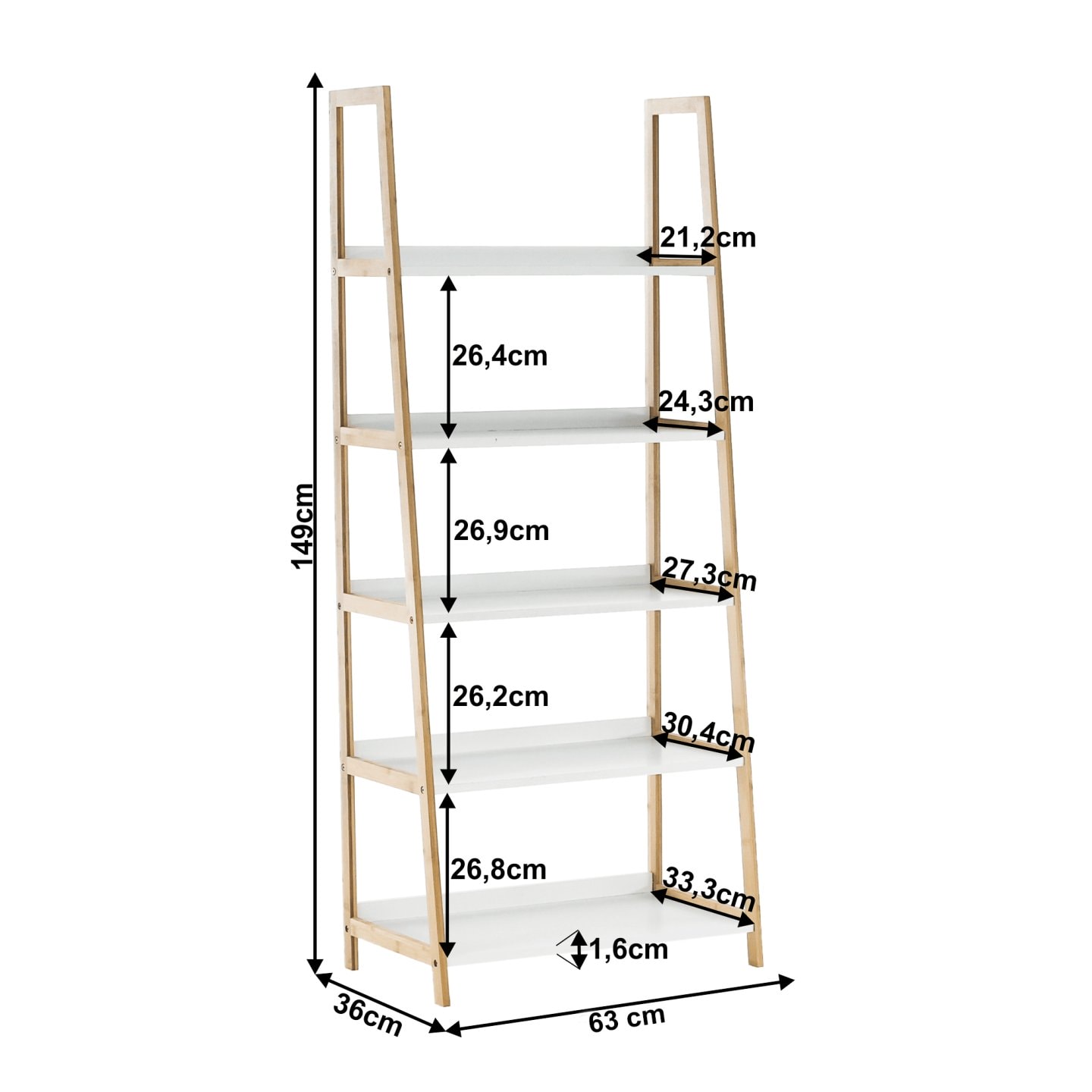 Víceúčelový regál Koen TYP 3 Materiál: MDF / bambus lakovaný Barva: bílá / přírodní Rozměry (ŠxHxV): 63x36x149 cm Tloušťka materiálu stojan: 1,4 cm Tloušťka materiálu police: 1,6 cm Nosnost na jednu polici: 5 kg 5 polic Hloubka vrchní police: 21,2 cm Hloubka 2. police: 24,3 cm Hloubka 3. police: 27…