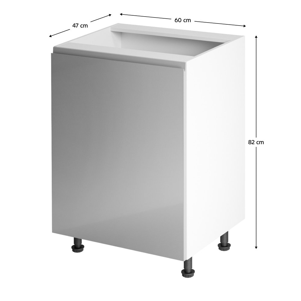 Spodní skříňka, Aurora D601F Provedení: DTD laminové / MDF Barva: bílá / šedá extra vysoký lesk Rozměry (ŠxHxV): 60x47x82 cm Tloušťka materiálu: 15 mm Systém tichého zavírání dvířek Pracovní deska není součástí skříněk. Je možné si doobjednat pracovní desku v provedení dub artisan tloušťky 38 mm za…