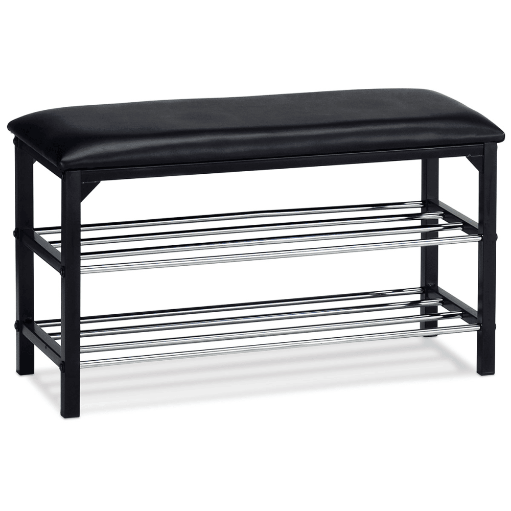 Praktický kovový botník s dvěma rošty, který zároveň slouží i jako sedací lavice. Díky svým rozměrům má ideální ložnou plochu na uložení bot, ale prostorově se vejde i do menších předsíní. Měkký sedák je potažen černou hladkou ekokůží, výplň je z PU pěny. Kostra botníku je ze svařovaných profilů v povrchové úpravě černou matnou práškovou barvou. Rošty jsou z kovových chromovaných trubek o průměru 12 mm. Nosnost na sezení je 90 kg, nosnost jednotlivých polic je 8 kg. Dodáváno v demontu. S tímto botníkem bude přezouvání vždy pohodlné a bezpečné.