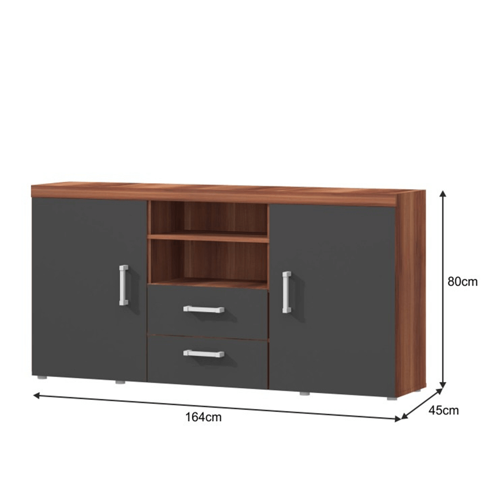 Materiál: DTD laminovaná Barva: švestka / šedý grafit Rozměry (ŠxHxV): 164x45x80 cm Tloušťka materiálu: 16 mm 2 skříňky Otevřený úložný prostor 2 šuplíky Dodávané v demontu
