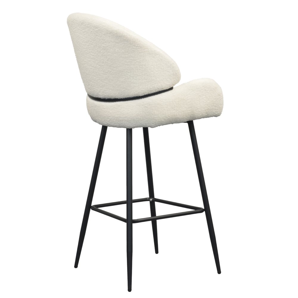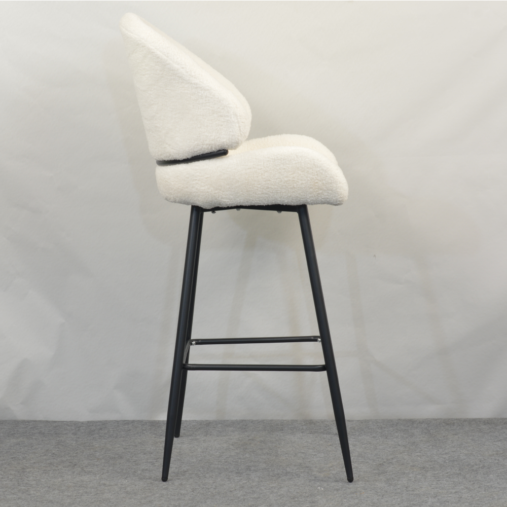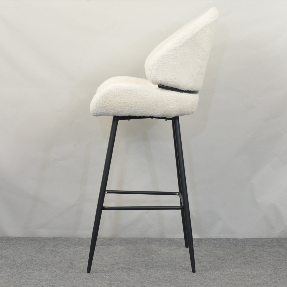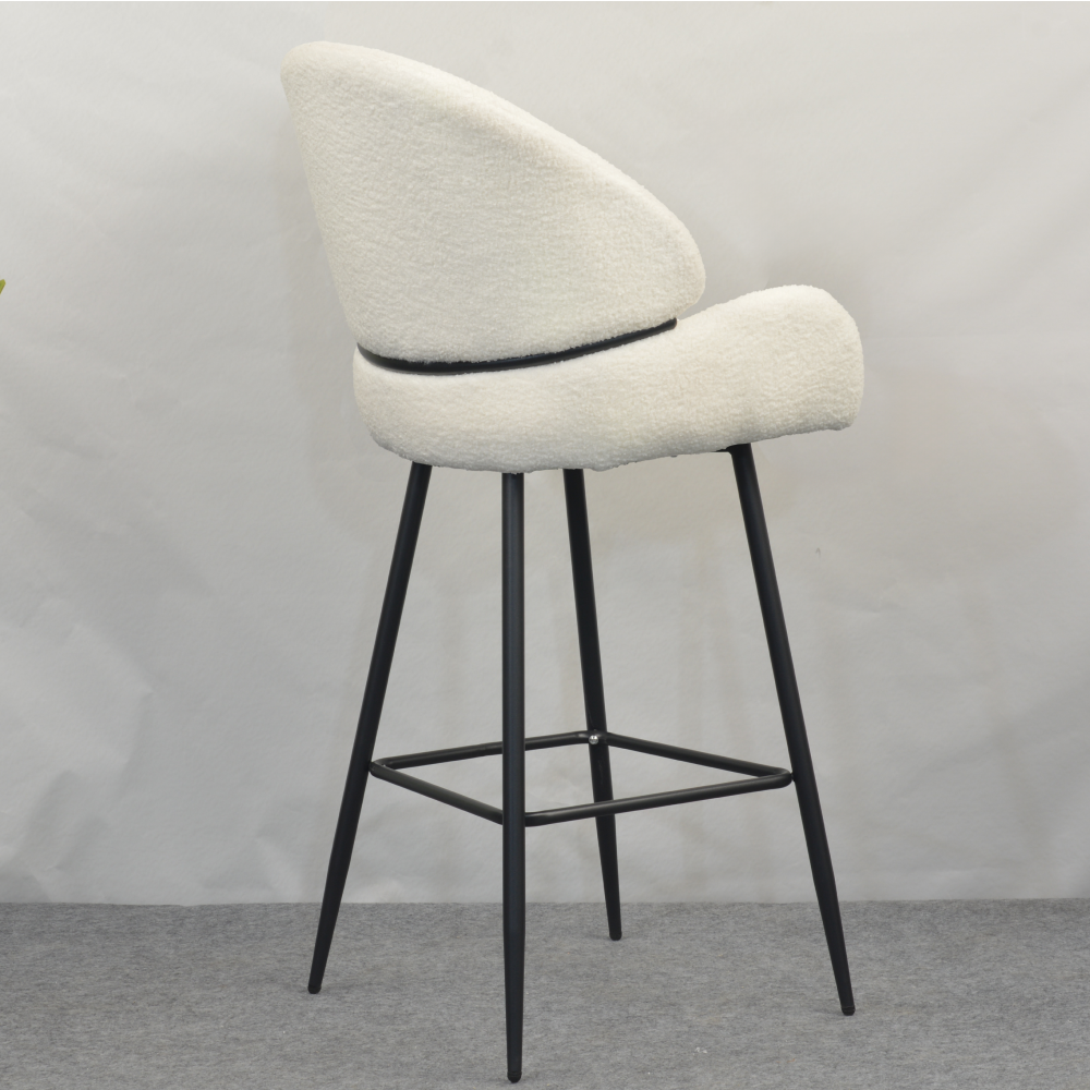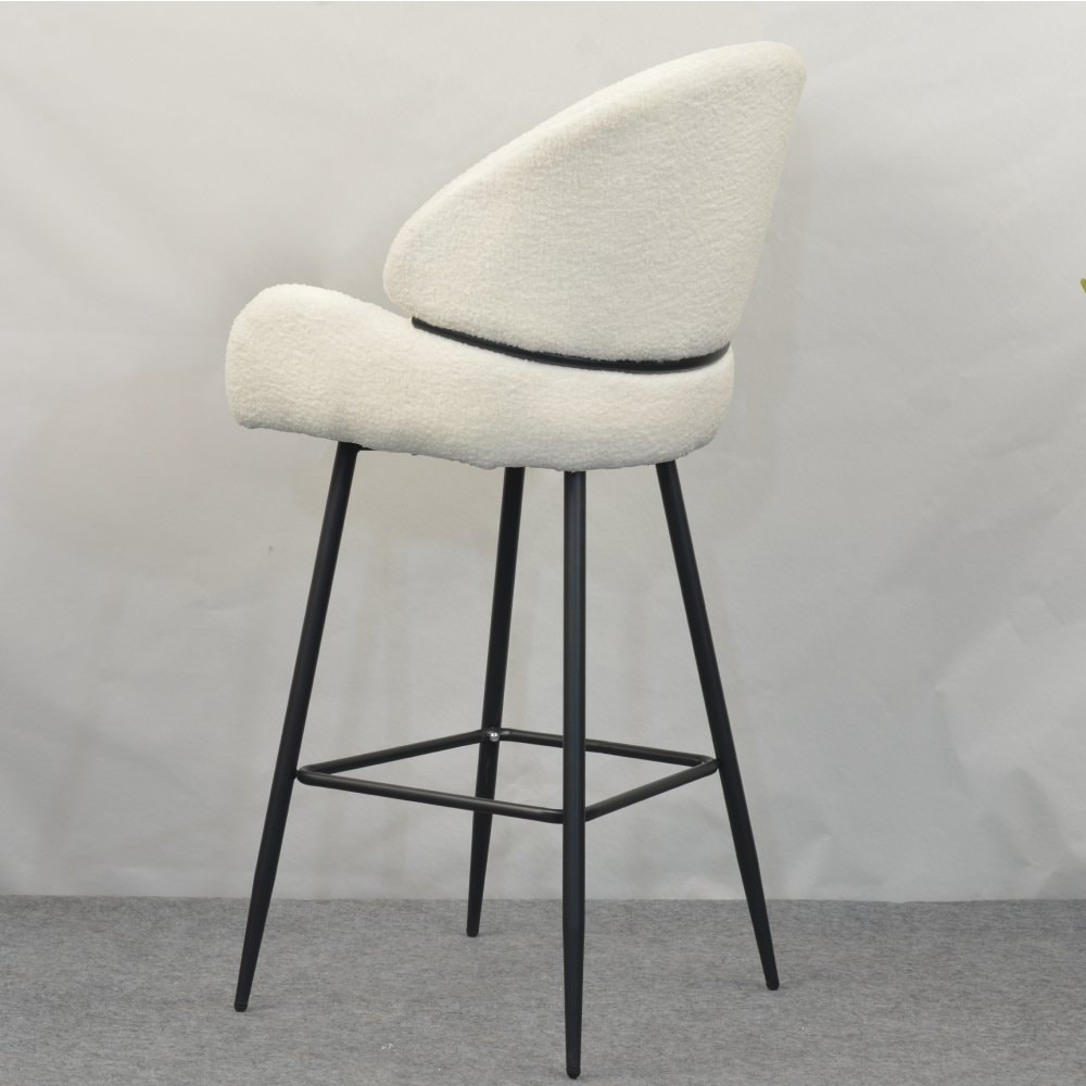 Barová židle SANAKO TYP 2 si získá vaši pozornost už na první pohled. Je dokonalým ztělesněním elegance, pohodlí a moderního designu. Její jemně zaoblené tvary a hebké čalounění z látky Bouclé v bílé barvě vytvářejí luxusní a útulný dojem. Kontrastní černé kovové nohy dodávají židli stabilitu a zároveň moderní šmrnc, díky čemuž se stává výrazným, ale stále harmonickým prvkem vaší jídelny či kuchyně. SANAKO TYP 2 působí svěže, moderně, útulně a je jako stvořená pro stylové a pohodlné stolování v domácím prostředí či v elegantních interiérech.