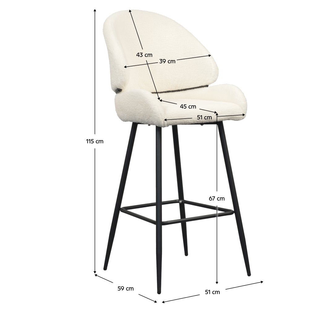 Materiál: látka Bouclé/kov Oděruodolnost textilie podle testu Martindale: 45 000 oděrů Barva: bílá/černá Rozměry (ŠxHxV): 51x59x115 cm Výška sedu: 67 cm Hloubka sedu: 45 cm Šířka sedu: 51 cm Výška zádové opěrky: 43 cm Šířka zádové opěrky: 39 cm Nosnost: 100 kg Kovová konstrukce Designové Dodáváno v…