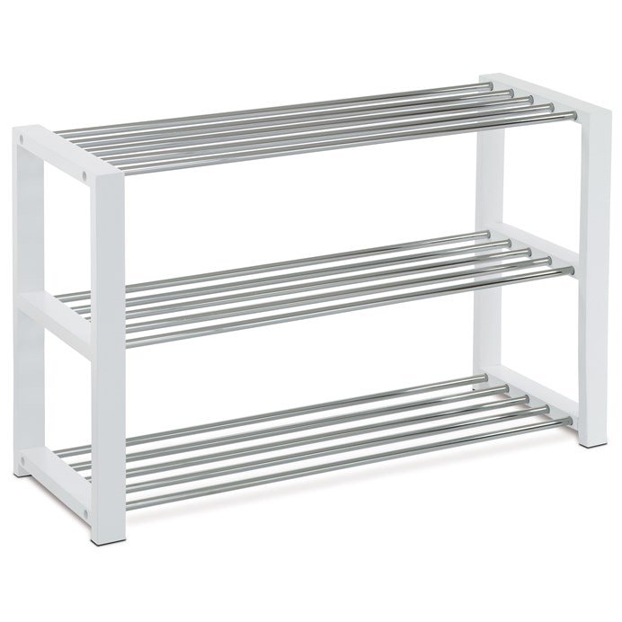 Botník s třemi policemi z chromovaného kovu a rámem z masivního kaučukovníku v bílé matné barvě nabízí praktické a pevné řešení pro uspořádání obuvi. Masivní dřevěný rám je upraven kvalitním matným lakem, který zajišťuje snadnou údržbu a dlouhou životnost. Police z chromovaného kovu poskytují dostatek prostoru pro uložení více párů bot a zároveň umožňují jejich větrání. Stabilní provedení botníku zaručuje bezpečné a pevné umístění v předsíni či šatně. Kompaktní rozměry usnadňují jeho umístění i do menších prostor.
