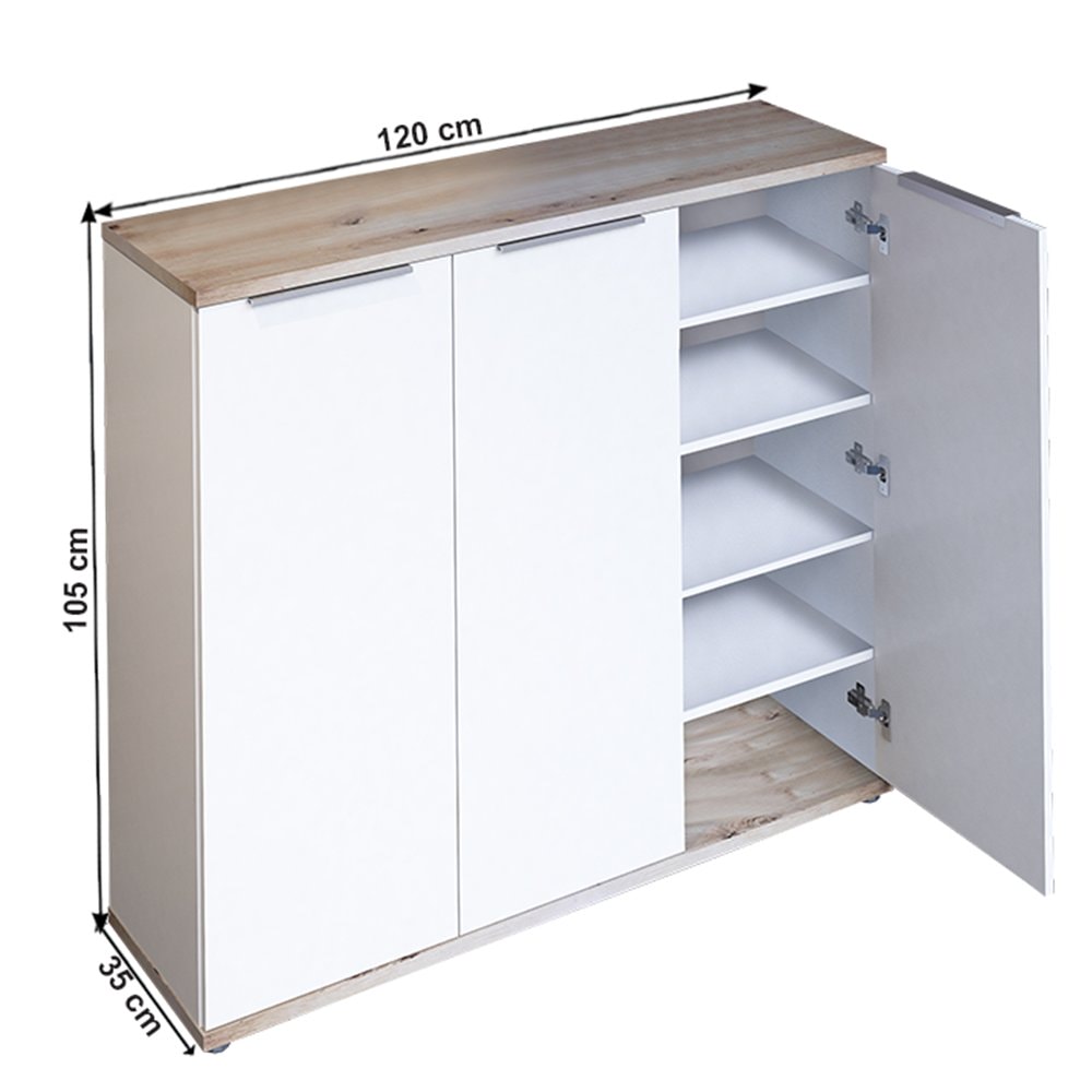 Botník, MODINI TYP 2 Materiál: DTD laminovaná / kov Barva: bílá / dub artisan Rozměry (ŠxHxV): 120x35x105 cm Tloušťka materiálu: 16/22 mm Třídveřová. Tři policové skříňky. Kovové úchytky. Dodávané v demontu.