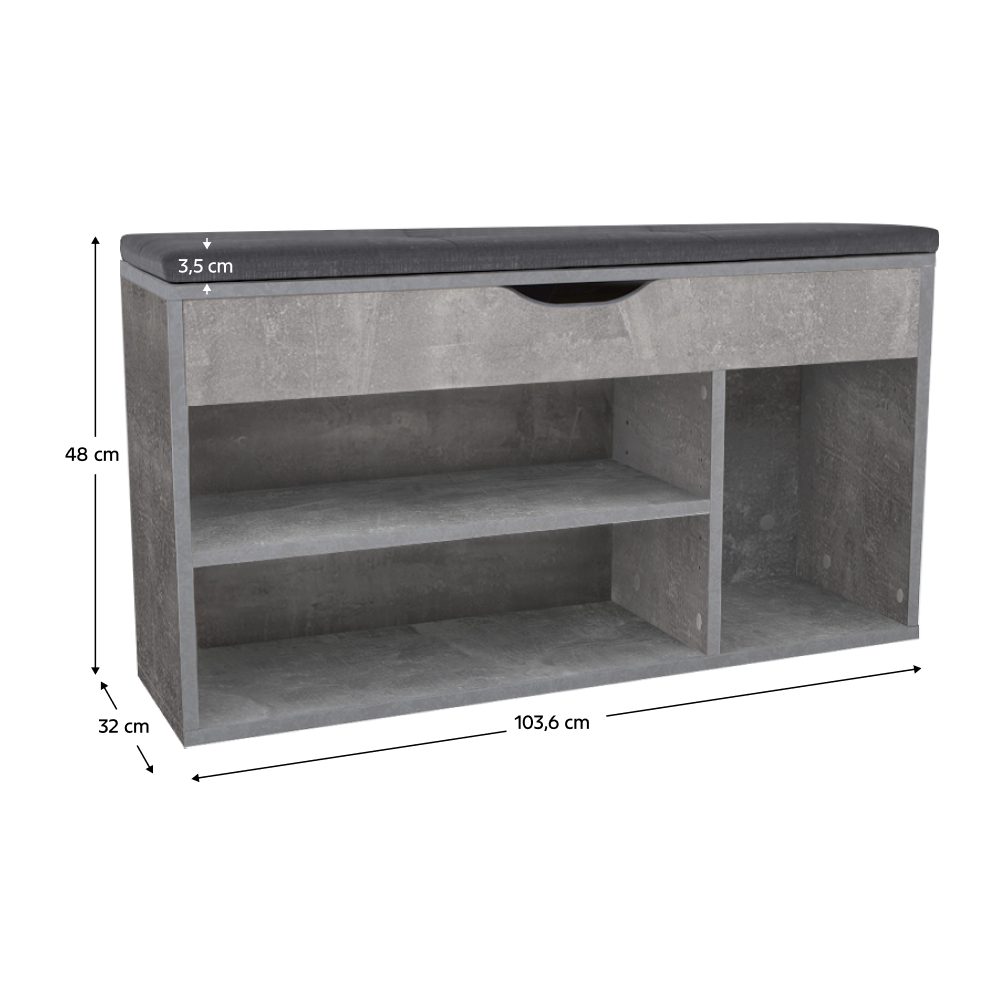 Materiál: DTD laminovaná Barva: beton Rozměry (ŠxHxV): 103,6x32x48 cm S policemi S dvířky Nosnost botníku: max. 90 kg Nosnost šuplíku: max. 7 kg Výška polštářku: 3,5 cm Výplň: molitan Dodáván v demontu