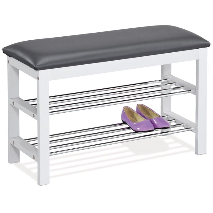 Botník s taburetem kombinuje praktické uspořádání s pohodlným posezením díky polstrovanému sedáku potaženému šedou ekokůží. Masivní rám z kaučukovníku v bílé barvě je doplněn o dvě chromované police, které nabízejí dostatek prostoru pro uložení obuvi. Pevné provedení zajišťuje stabilitu a dlouhou životnost, zatímco jednoduchý design umožňuje snadné začlenění do různých interiérů. Výška a rozměry taburetu jsou přizpůsobeny pro pohodlné sezení i praktické využití v předsíni či chodbě.