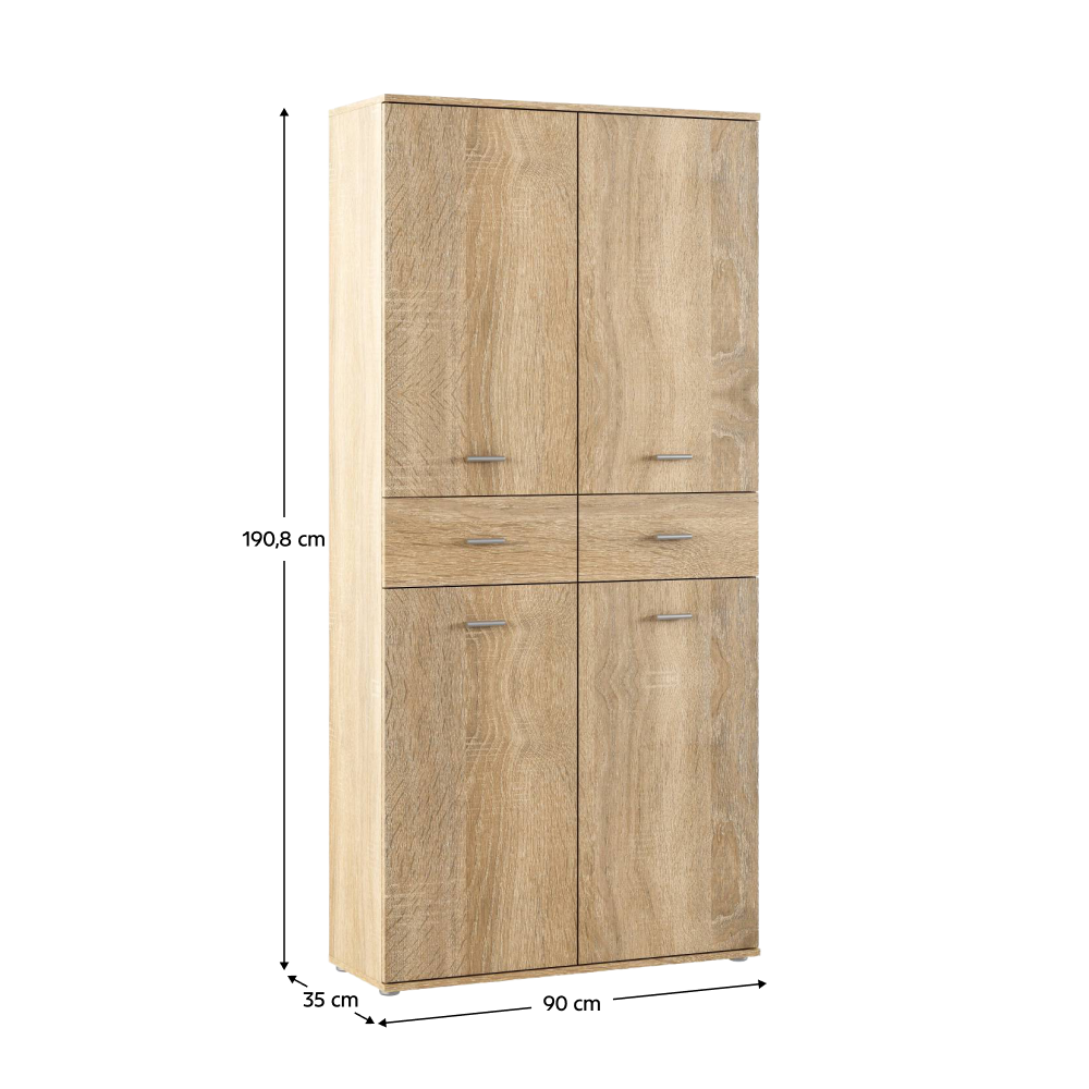 Materiál: DTD laminovaná Barva: dub sonoma Rozměry (ŠxHxV): 90x35x190,8 Tloušťka materiálu: 1,6 cm Policový Nosnost police: 5 kg 2 zásuvky Rozměry zásuvky (ŠxV): 44,6x18,8 cm Nosnost zásuvky: 5 kg Dvoudveřový S úchytkami Materiál úchytek: PVC Barva úchytek: stříbrná Na kluzácích Praktický…