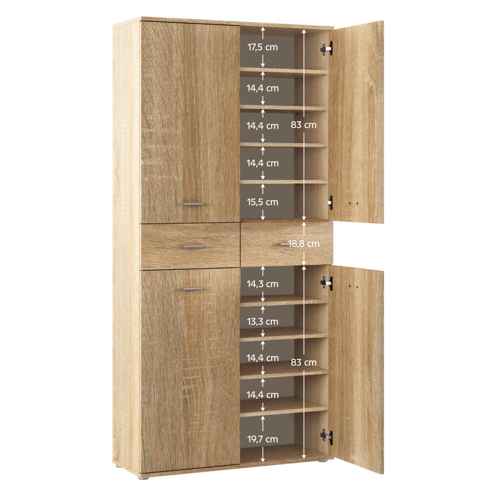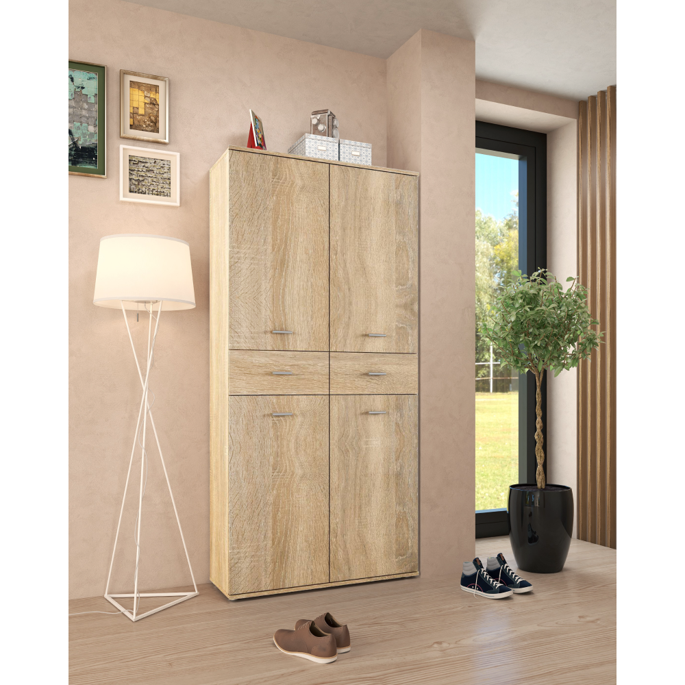 Je to praktický pomocník, který si zaslouží místo v kanceláři jako regál, v předsíni jako botníková skříň a také jako univerzální úložný prostor. Vyroben je z laminované DTD v barevném provedení dub sonoma. Obsahuje několik polic ukrytých za dvířky, které poskytují dostatek prostoru pro organizaci bot pro celou rodinu a středovou část doplňují dvě praktické zásuvky. Dvířka a zásuvky jsou vybaveny stříbrnými úchyty z PVC, které přispívají k modernímu vzhledu. Celkový design je jednoduchý, ale elegantní, díky čemuž se hodí do moderních i klasických interiérů.