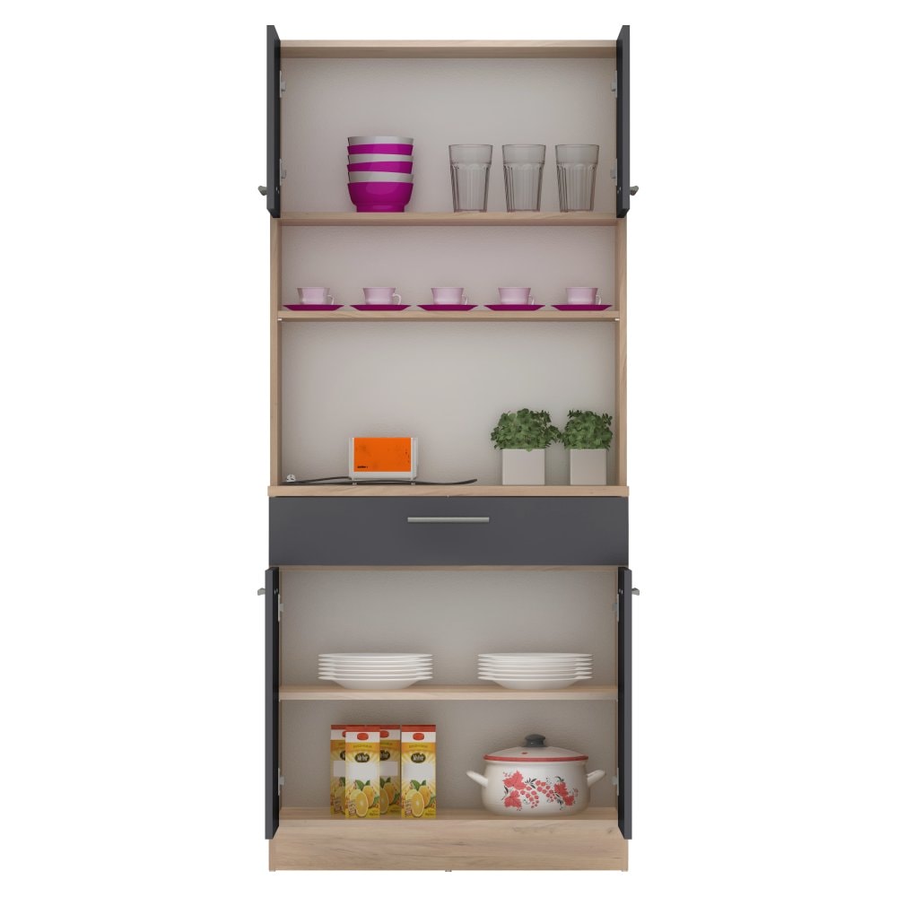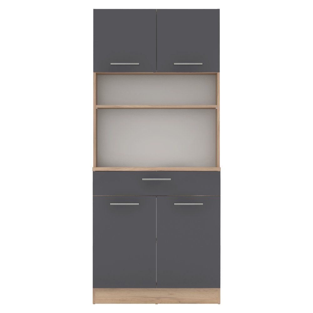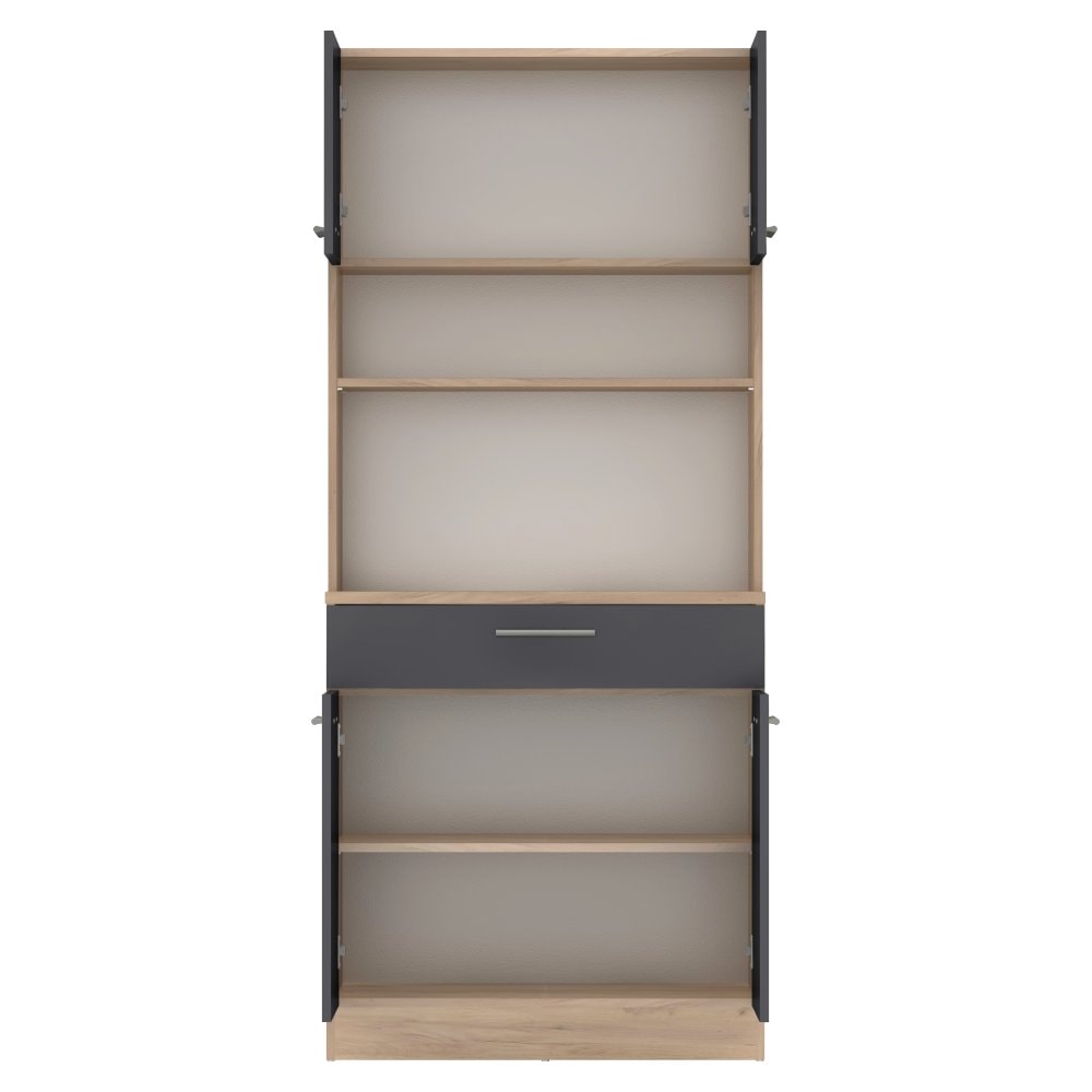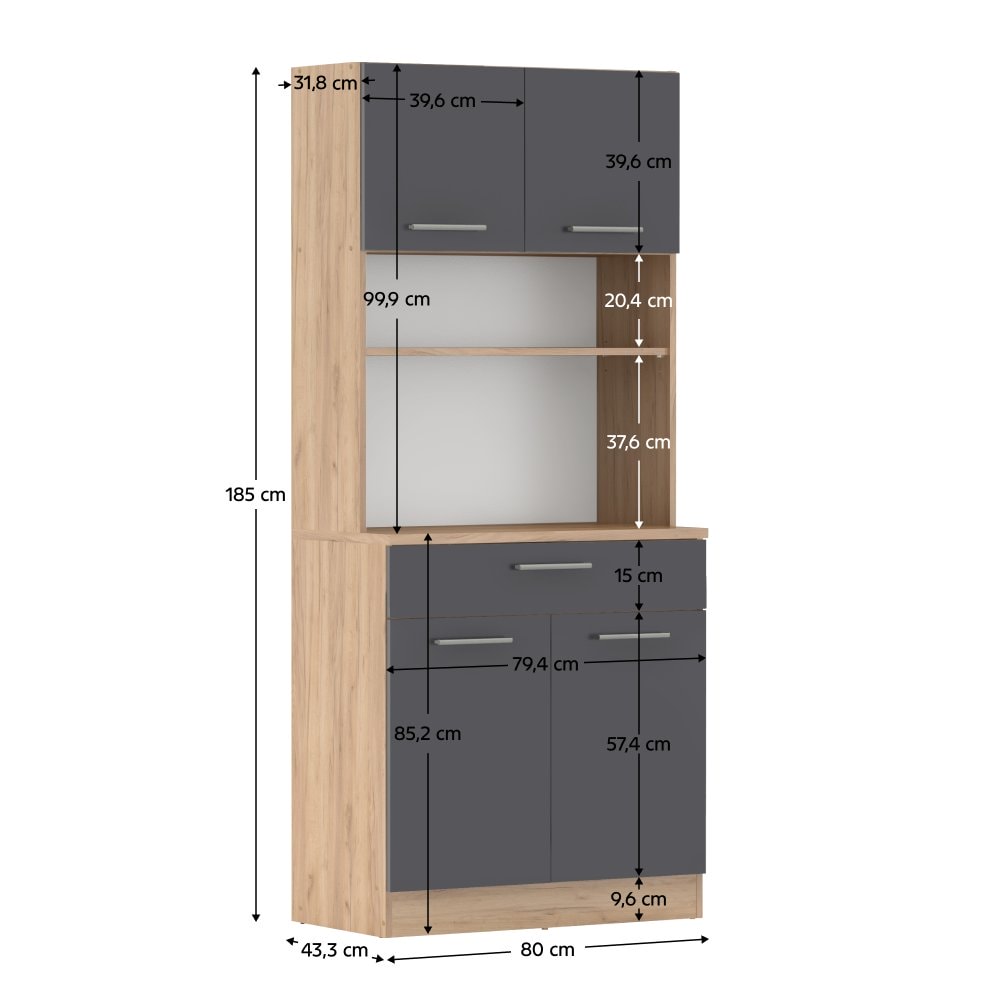 Materiál: laminovaná DTD Barva: dub artisan/grafit Rozměry (ŠxHxV): 80x43,3x185 cm Tloušťka materiálu: 1,6 cm Tloušťka vrchního plátu spodní skříňky: 2,2 cm Čtyřdveřový Policový Nosnost police: 5 kg 1 zásuvka Rozměry zásuvky (ŠxV): 79,4x15 cm Nosnost zásuvky: 5 kg S úchytkami Materiál úchytek: PVC…