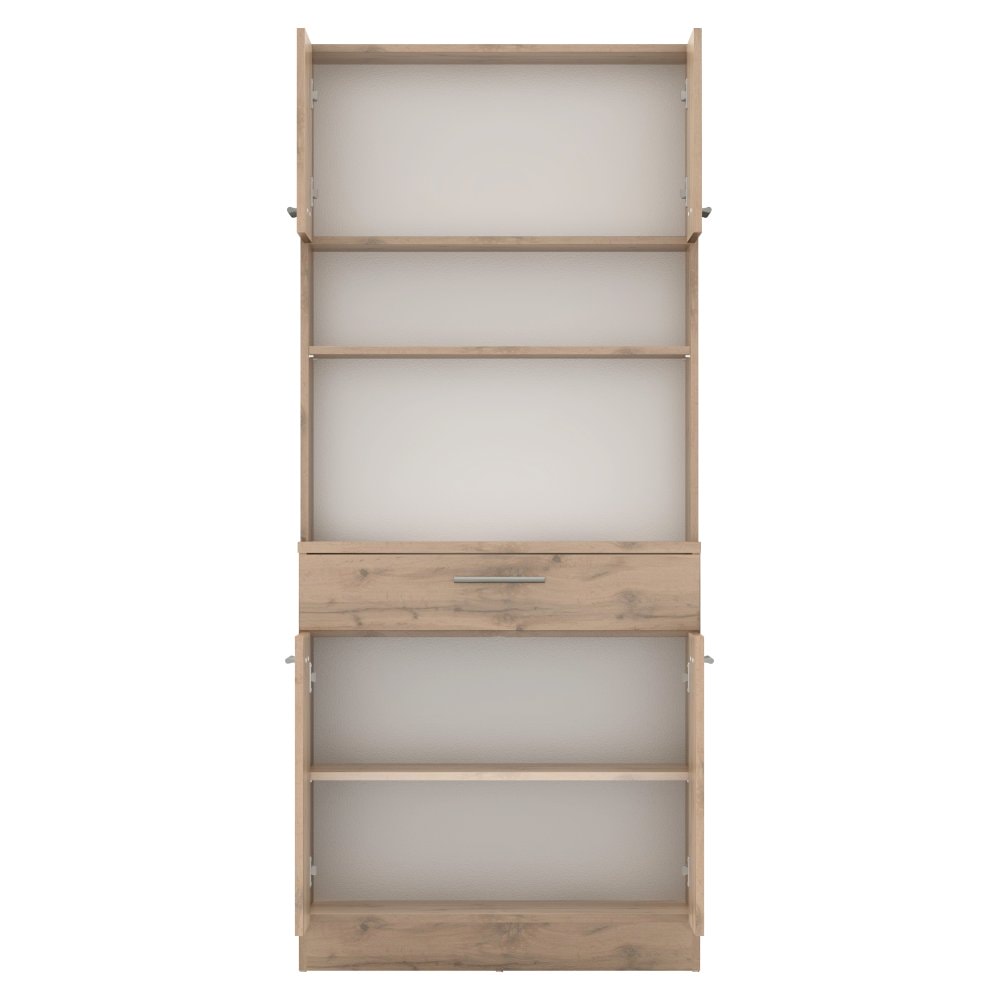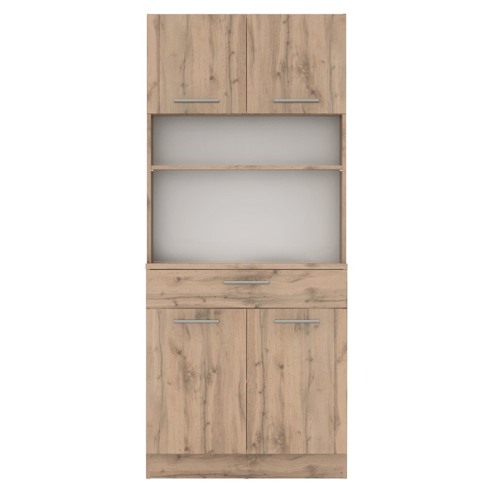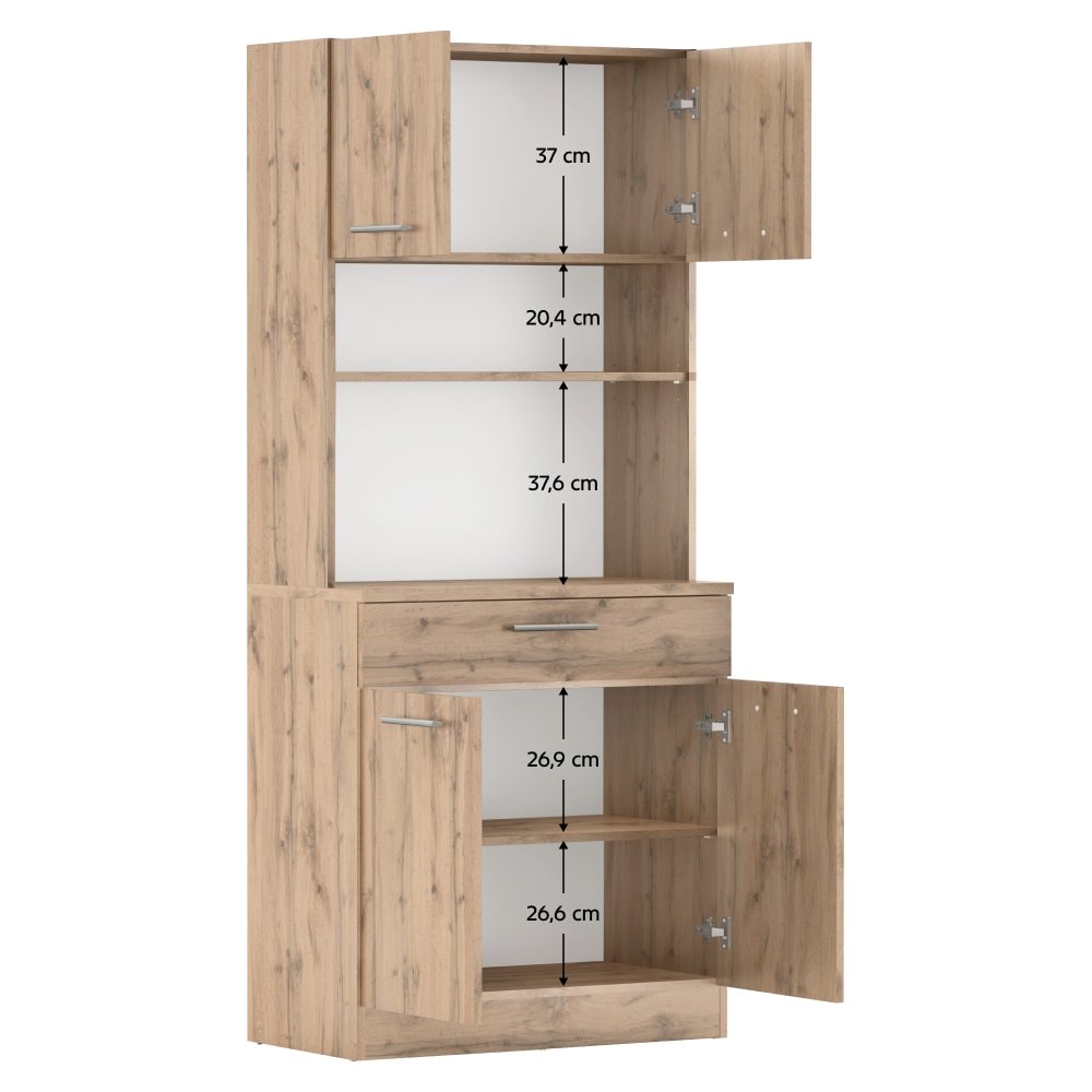 Materiál: laminovaná DTD Barva: dub wotan Rozměry (ŠxHxV): 80x43,3x185 cm Tloušťka materiálu: 1,6 cm Tloušťka vrchního plátu spodní skříňky: 2,2 cm Čtyřdveřový Policový Nosnost police: 5 kg 1 zásuvka Rozměry zásuvky (ŠxV): 79,4x15 cm Nosnost zásuvky: 5 kg S úchytkami Materiál úchytek: PVC Barva…