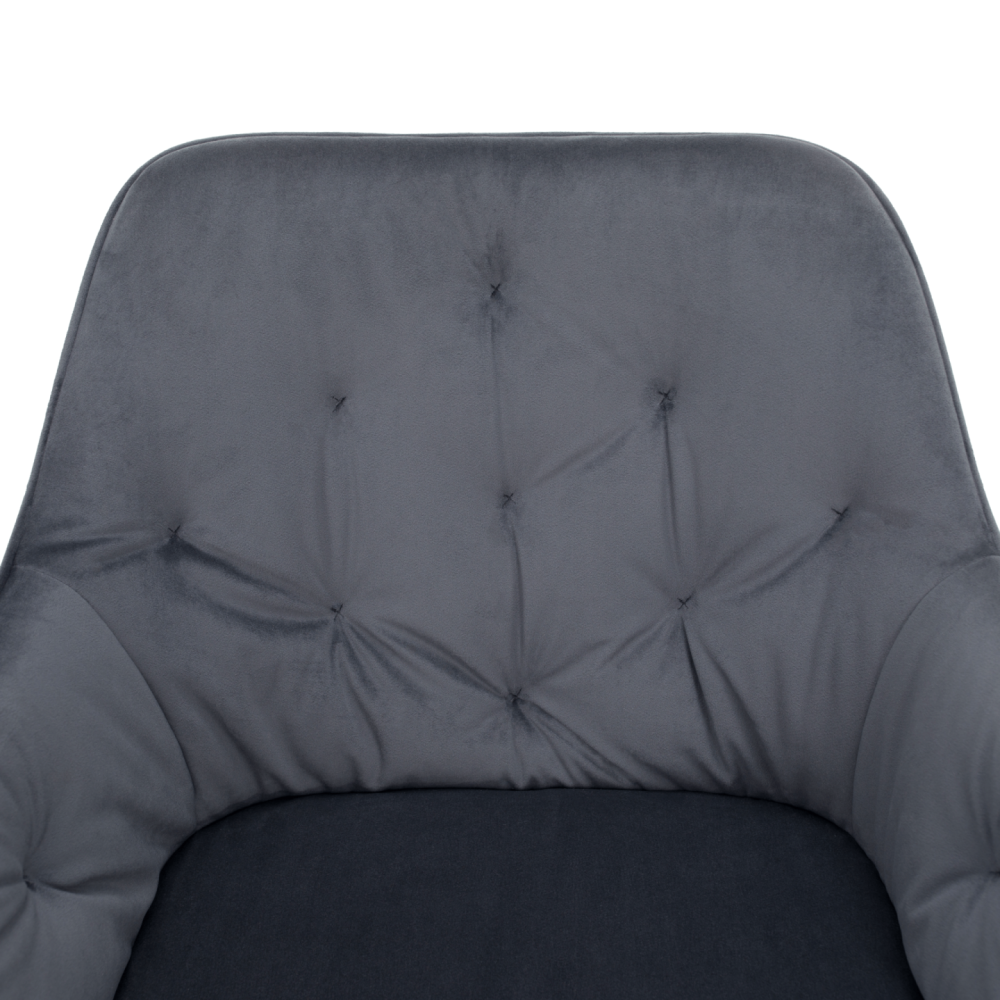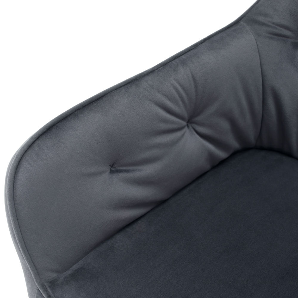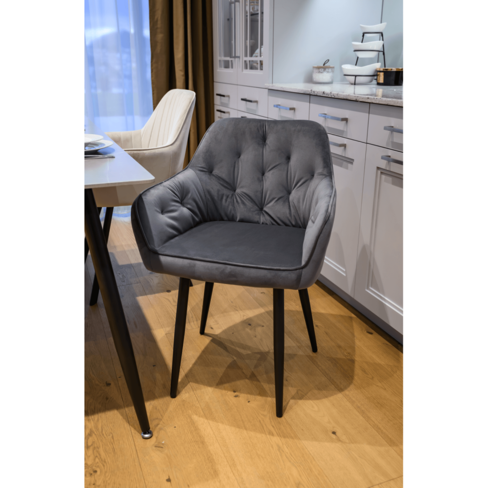 Čalouněné je sametovou Bluvel látkou v odstínu šedé Velvet. O stabilitu křesla se postarají černé kovové nohy. Na komfortu sezení se spolupodílejí opěrky na ruce a opěrka zad. Opěrky na ruce a zádová část jsou navíc dekorativně prošity. Vynikne v jakémkoli interiéru.