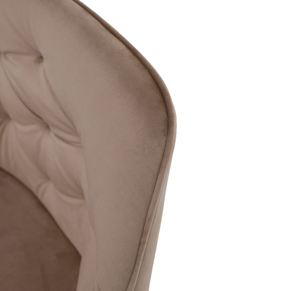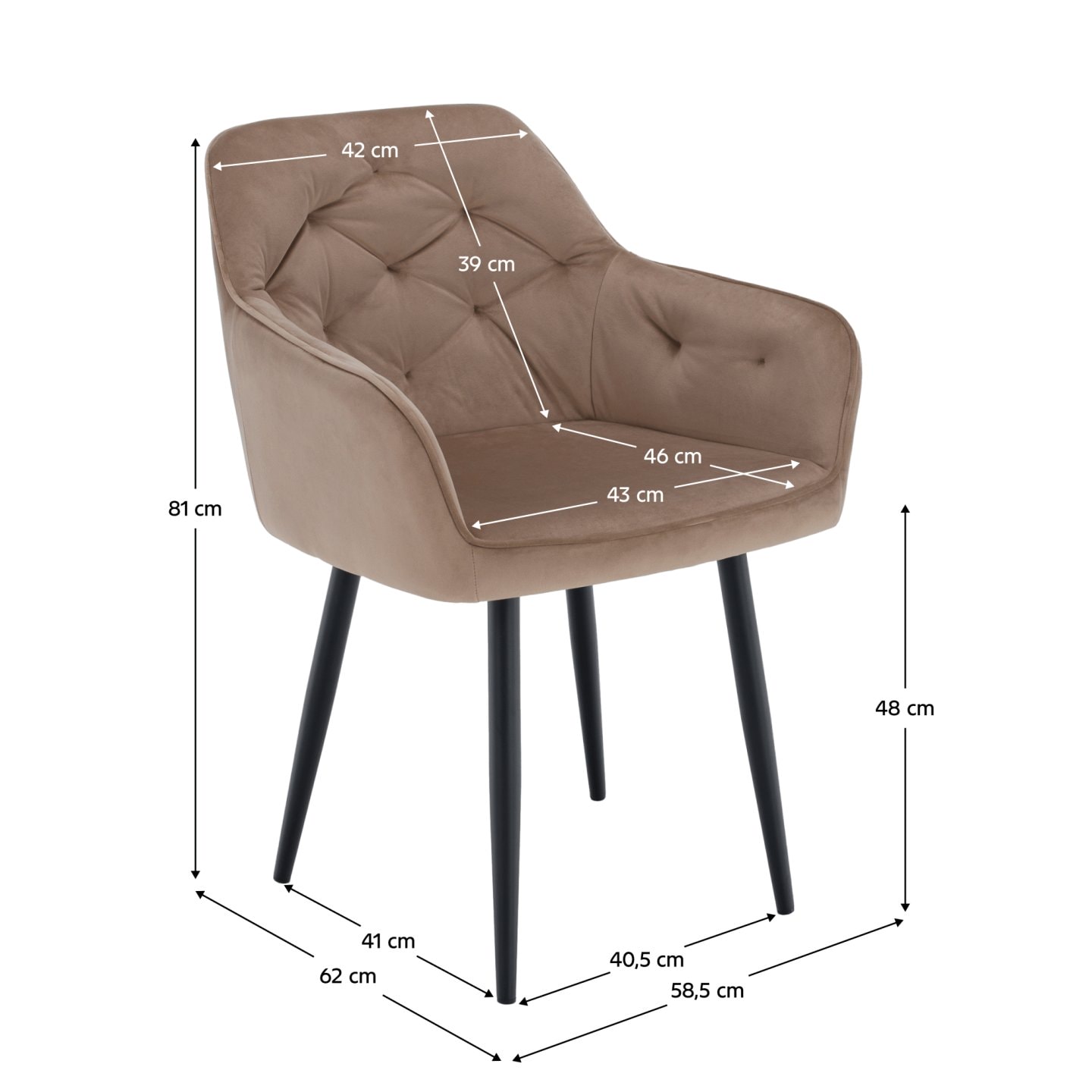 Materiál: látka Bluvel 28/kov Oděruodolnost textilie podle testu Martindale: 80 000 oděrů Barva: světle hnědá Velvet/černá Rozměry (ŠxHxV): 58,5x62x81 cm Výška sedu: 48 cm Hloubka sedu: 46 cm Šířka sezení: 43 cm Výška zádové opěrky: 39 cm Nosnost: 90 kg Designové Dekorativně prošité S měkkou sedací…