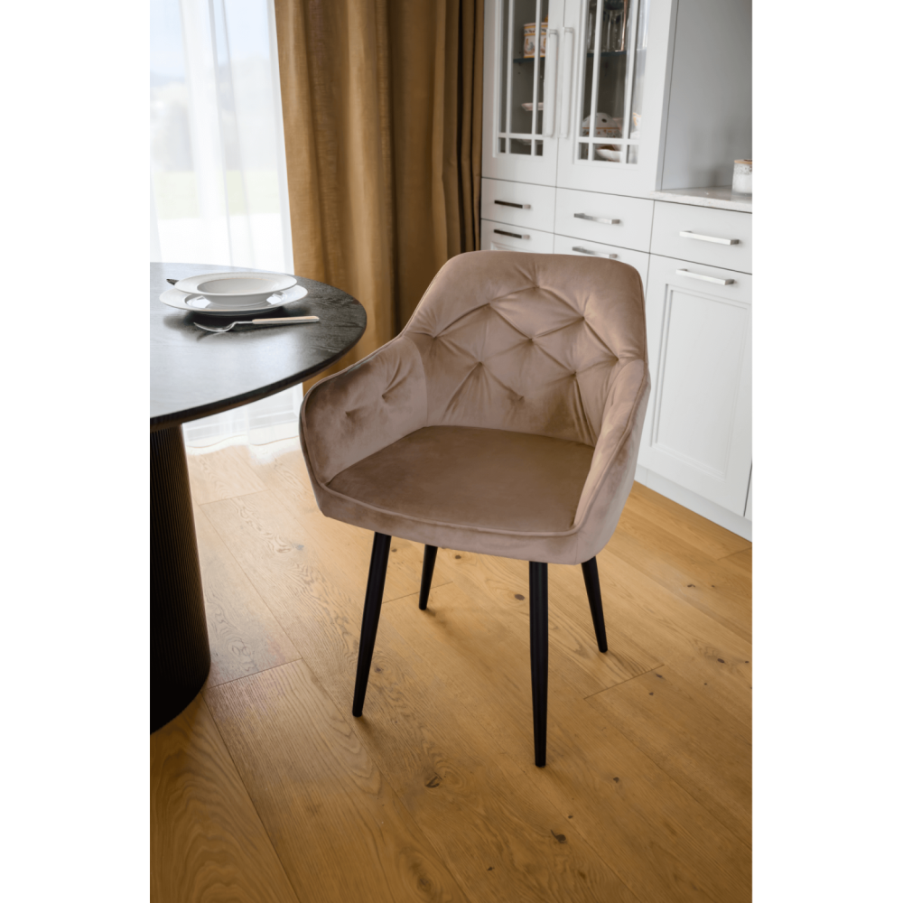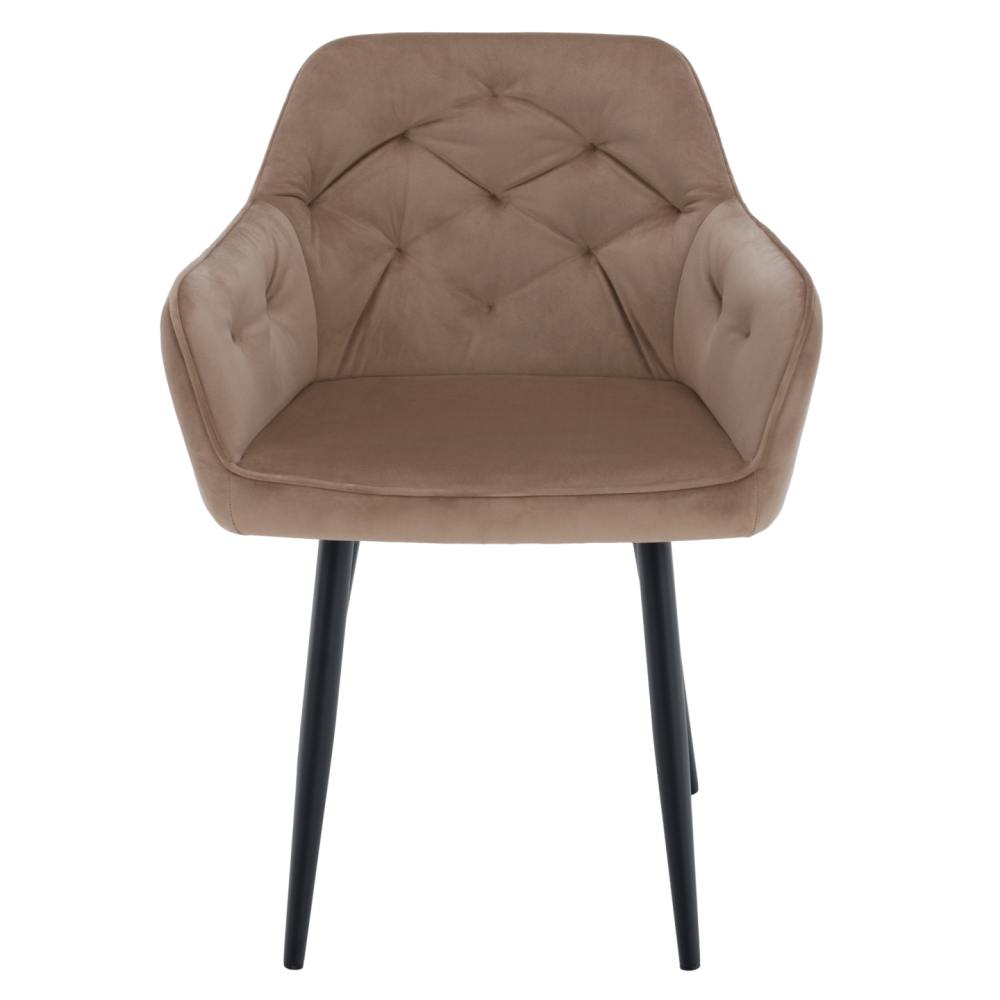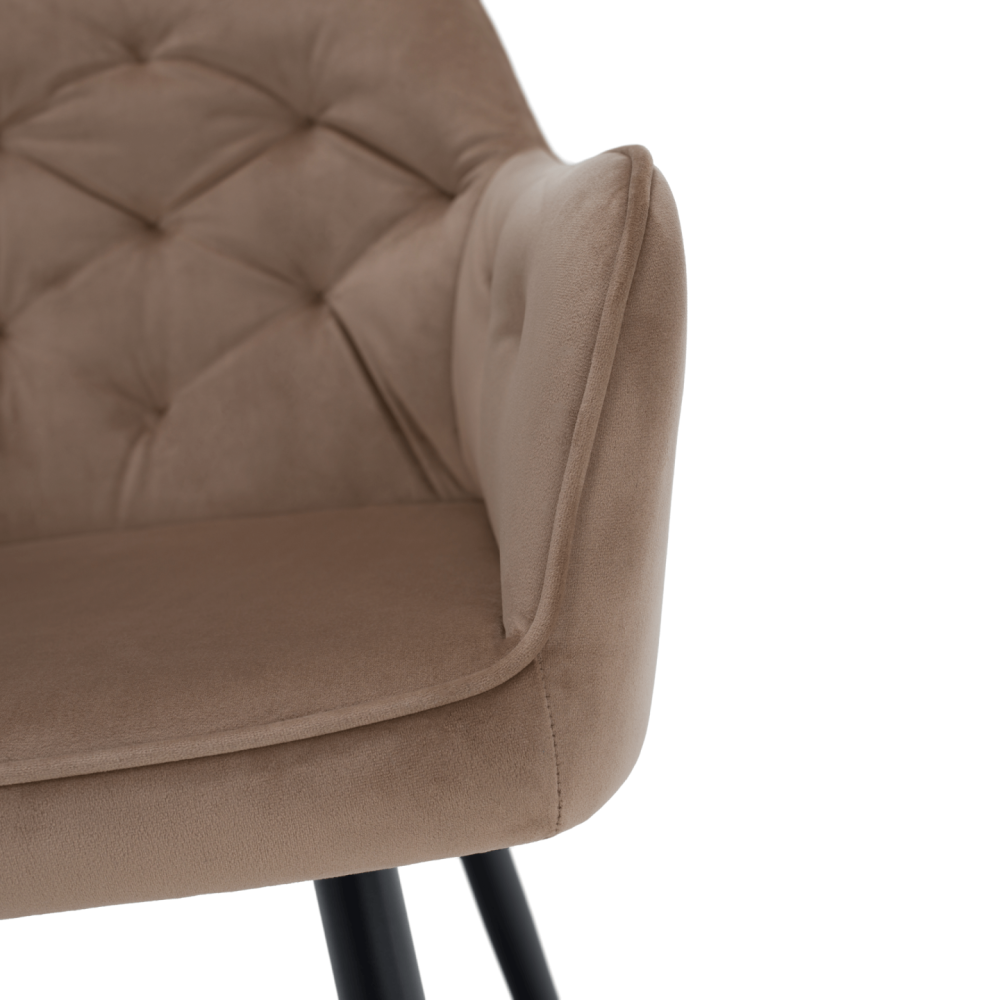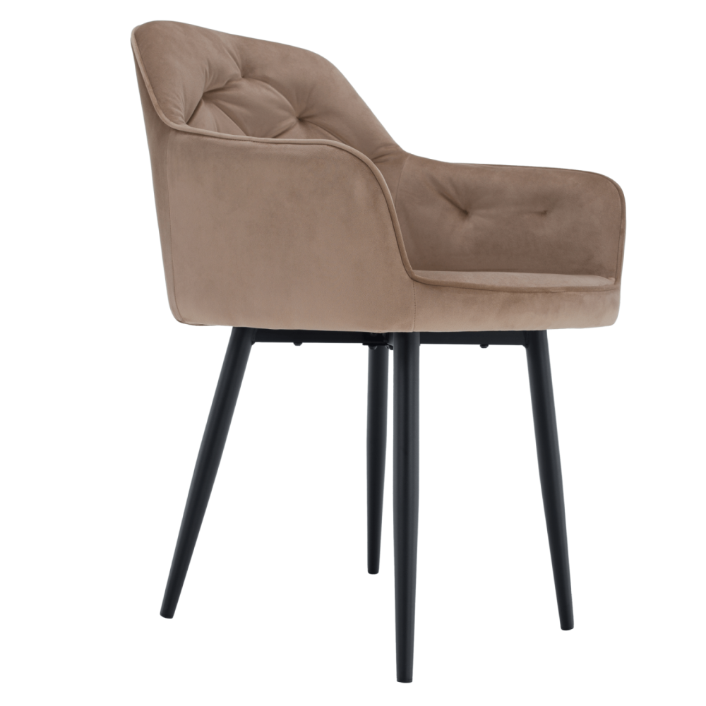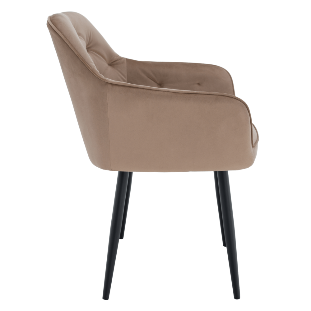 Čalouněné je sametovou Bluvel látkou v odstínu světle hnědá Velvet. O stabilitu křesla se postarají černé kovové nohy. Na komfortu sezení se spolupodílejí opěrky na ruce a opěrka zad. Opěrky na ruce a zádová část jsou navíc dekorativně prošity. Vynikne v jakémkoli interiéru.