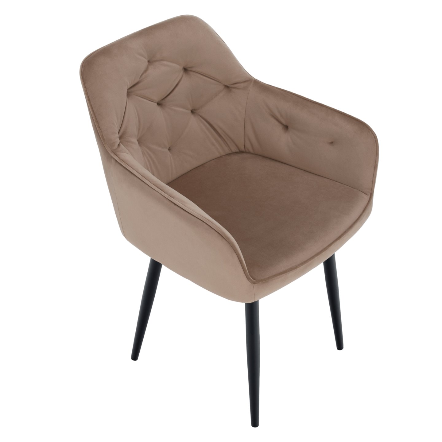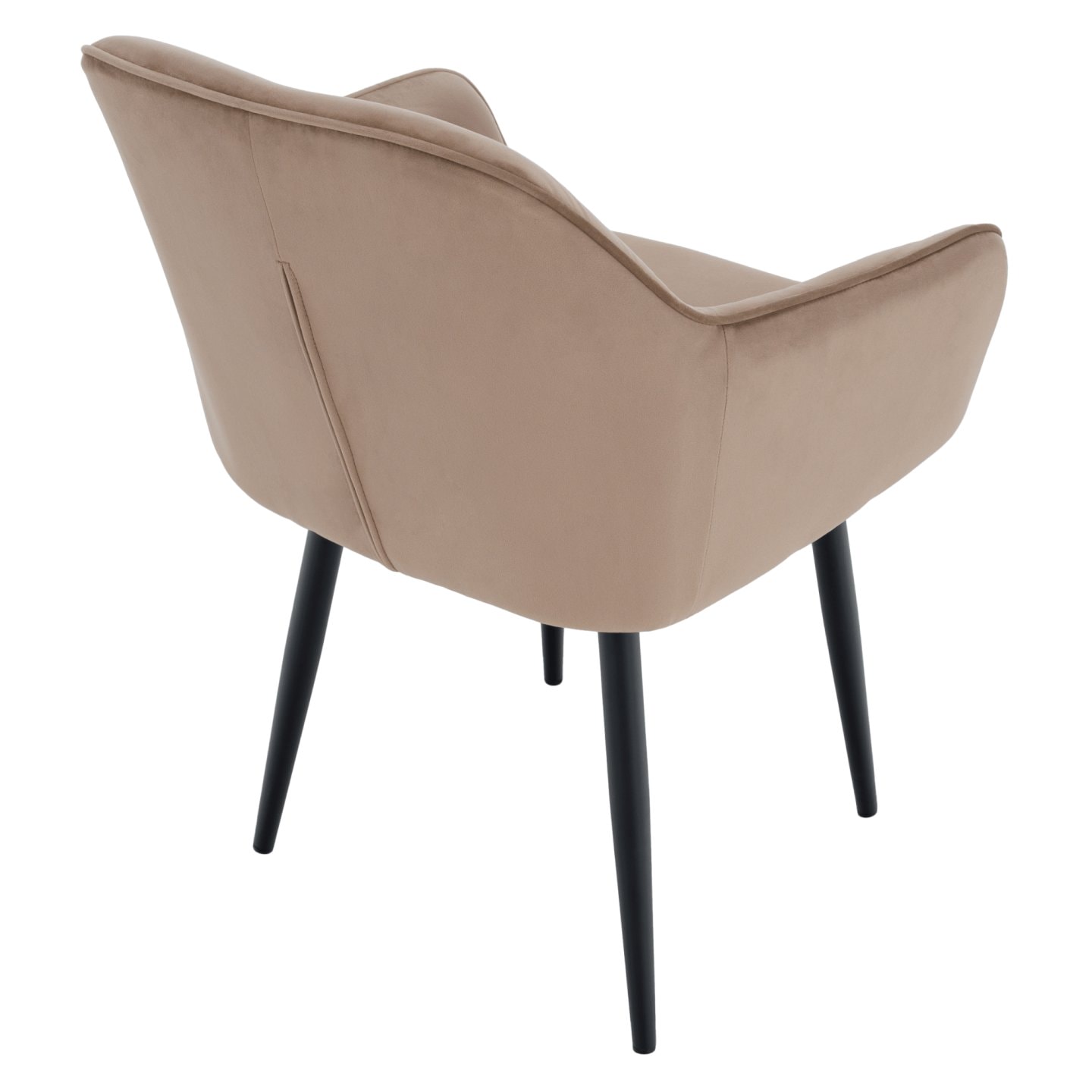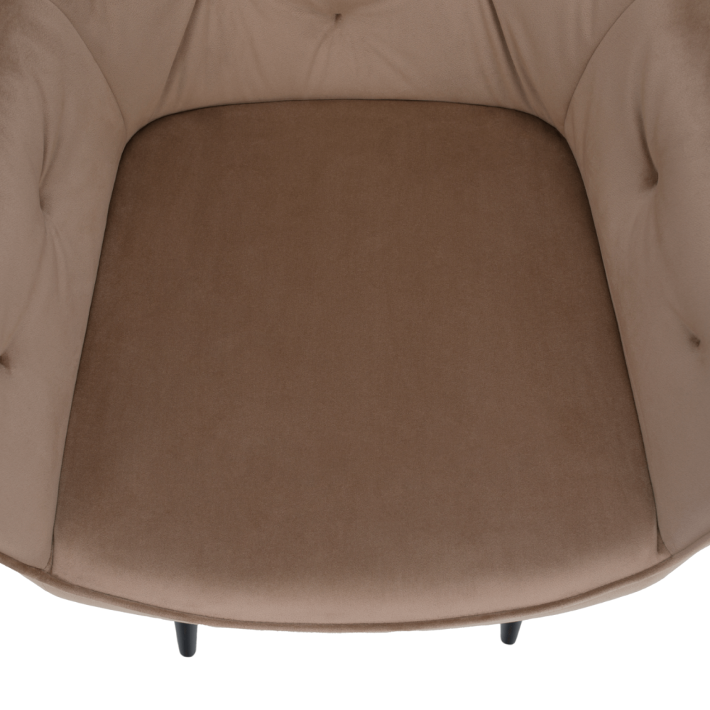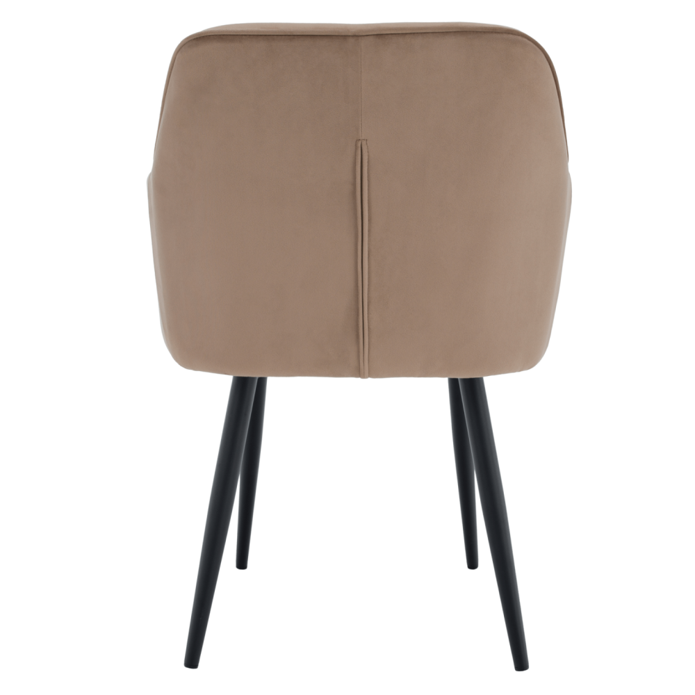 Čalouněné je sametovou Bluvel látkou v odstínu světle hnědá Velvet. O stabilitu křesla se postarají černé kovové nohy. Na komfortu sezení se spolupodílejí opěrky na ruce a opěrka zad. Opěrky na ruce a zádová část jsou navíc dekorativně prošity. Vynikne v jakémkoli interiéru.