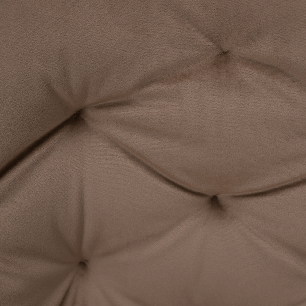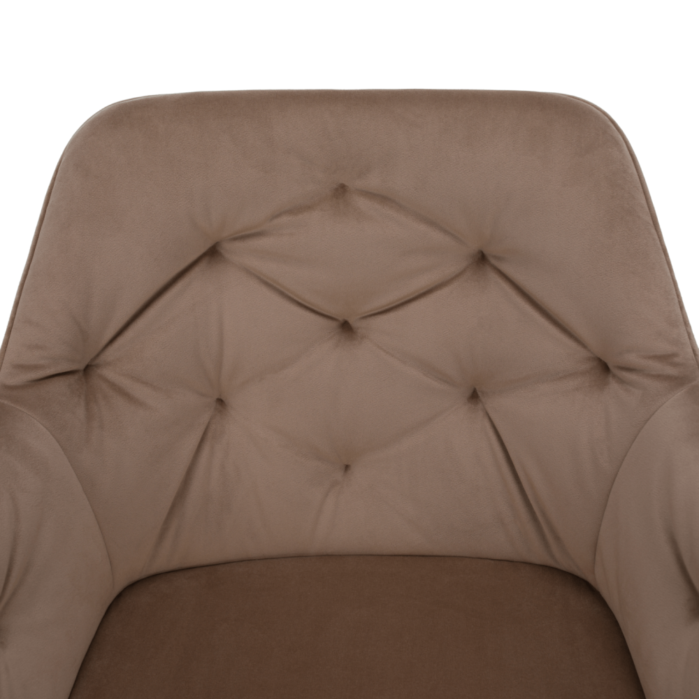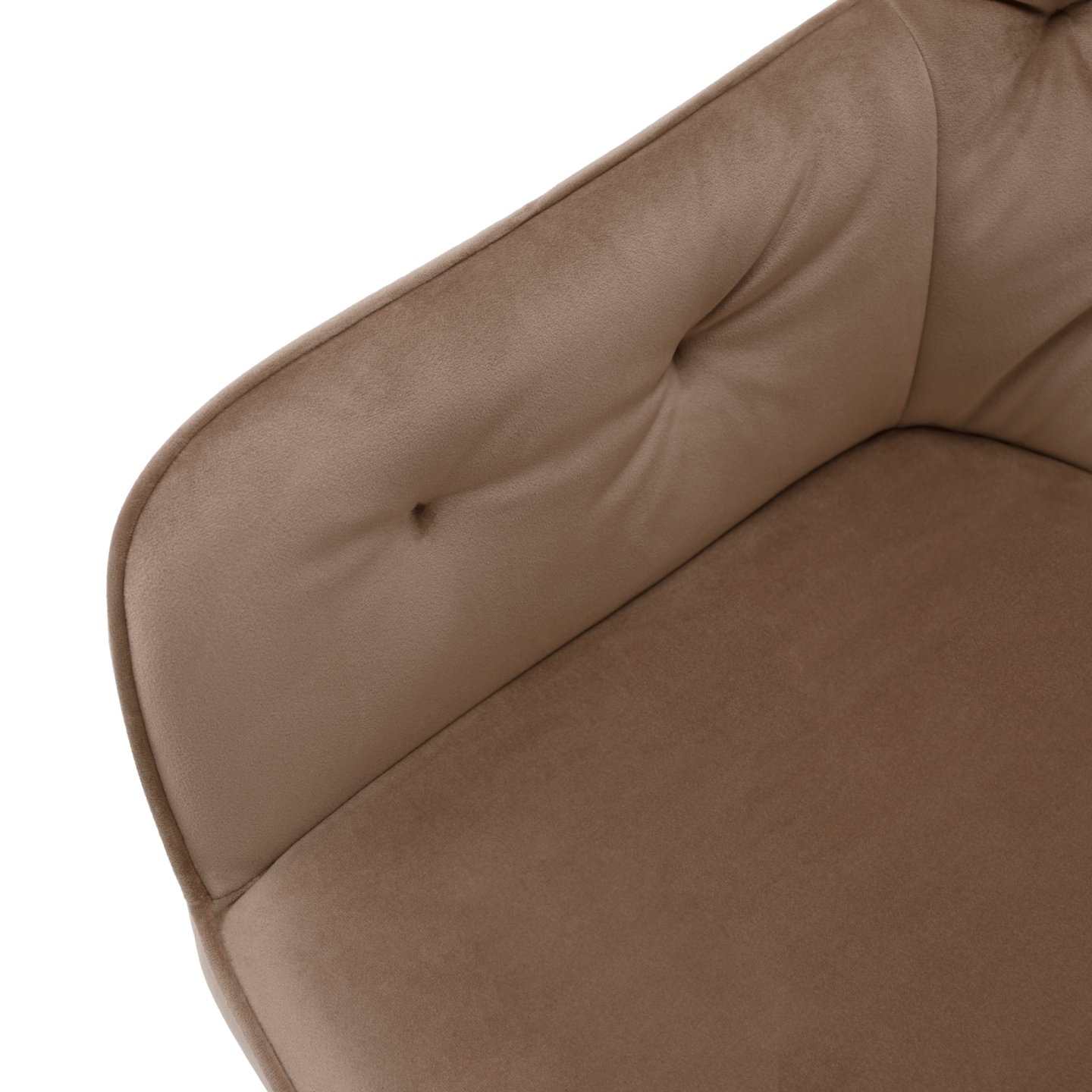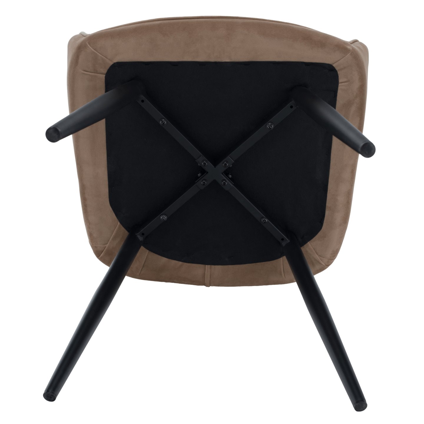 Čalouněné je sametovou Bluvel látkou v odstínu světle hnědá Velvet. O stabilitu křesla se postarají černé kovové nohy. Na komfortu sezení se spolupodílejí opěrky na ruce a opěrka zad. Opěrky na ruce a zádová část jsou navíc dekorativně prošity. Vynikne v jakémkoli interiéru.