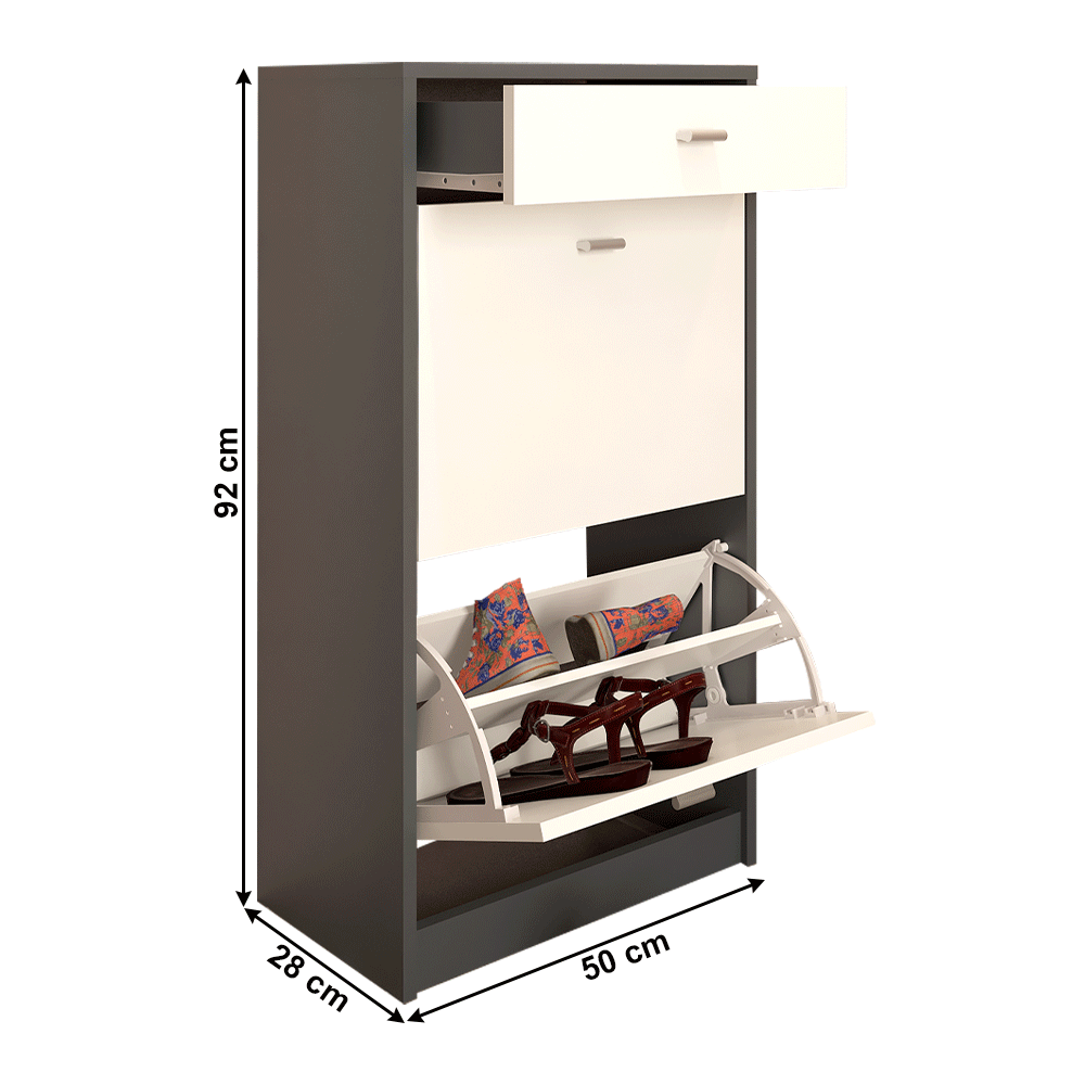 Vyrobený z kvalitní laminované DTD v barevném provedení grafit / bílá. Snadno zapadne do každé předsíně. Výklopný botník je určený na boty. Do botníku můžete jednoduše uložit velké i malé boty, a tím si udělat prostor při vstupu do domácnosti. Jednoduchý design skrývá v sobě praktičnost a funkčnost.