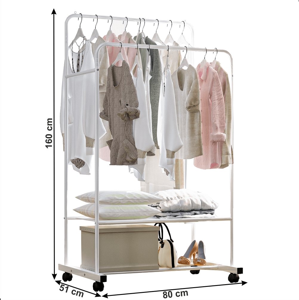 Materiál: kov Barva: bílá Rozměry (ŠxHxV): 80x51x160 cm pevná konstrukce dvě police Dvě věšákové tyče dvouřadý věšák Stojan na oblečení kolečka 2 kolečka s brzdou Nosnost: 30 kg Dodávané v demontu