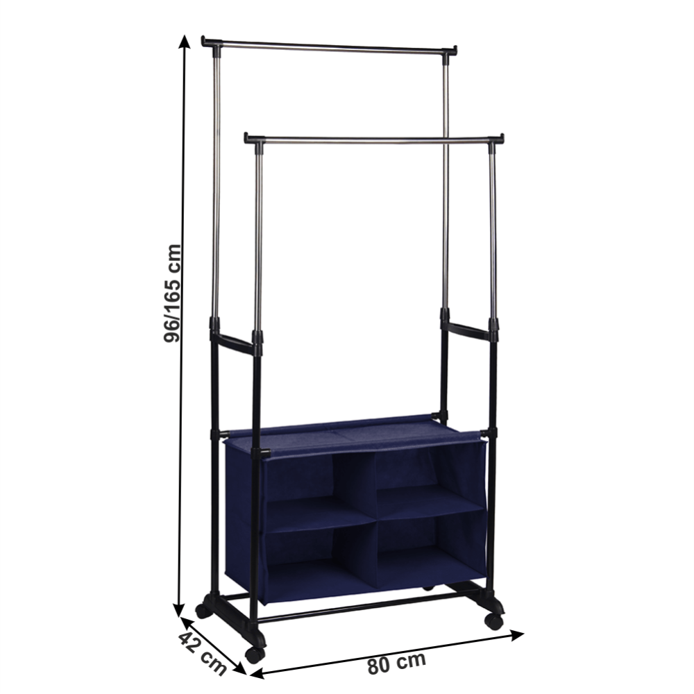 Zaručí pořádek nejen v oblečení, ale vytvoří také dojem uklizené místnosti. Vyroben je z nerezové oceli a plastu v kombinaci barev stříbrná a černá. Dvě věšákové tyče využijete na zavěšení košil, šatů, ale i jiného oblečení. Ve spodní části se nachází látkový box rozdělen na čtyři komory.