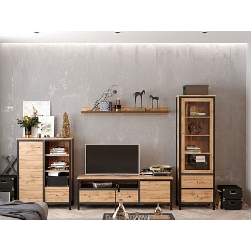 Obývací stěna FLAME je vyrobena z lamina v barevném provedení dub taxo/černá. Je rozdělena do praktických částí, které pojmou dostatek věcí.