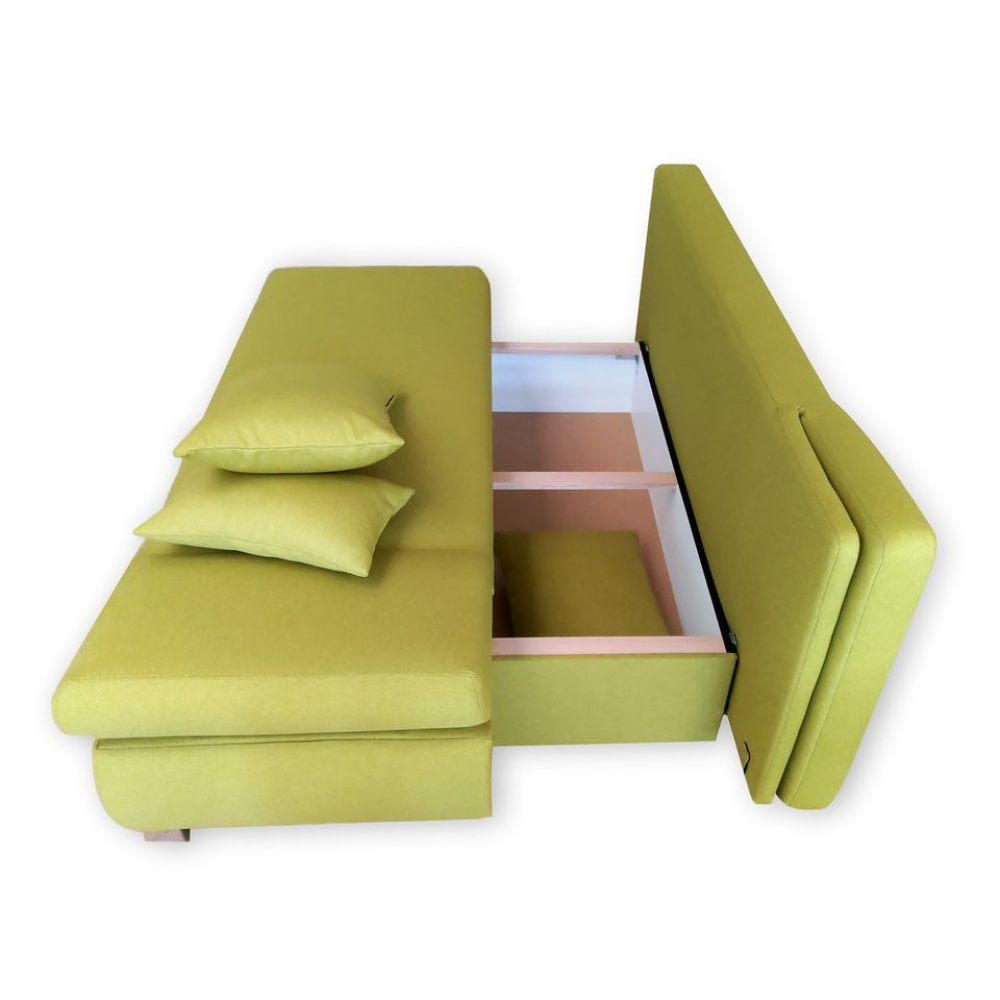 Lůžko je vyrobeno z lamelového roštu a tlačných pružin. Je tedy ideální volbou do menších bytů, kde skloubí funkce sedačky, relaxu a postele.