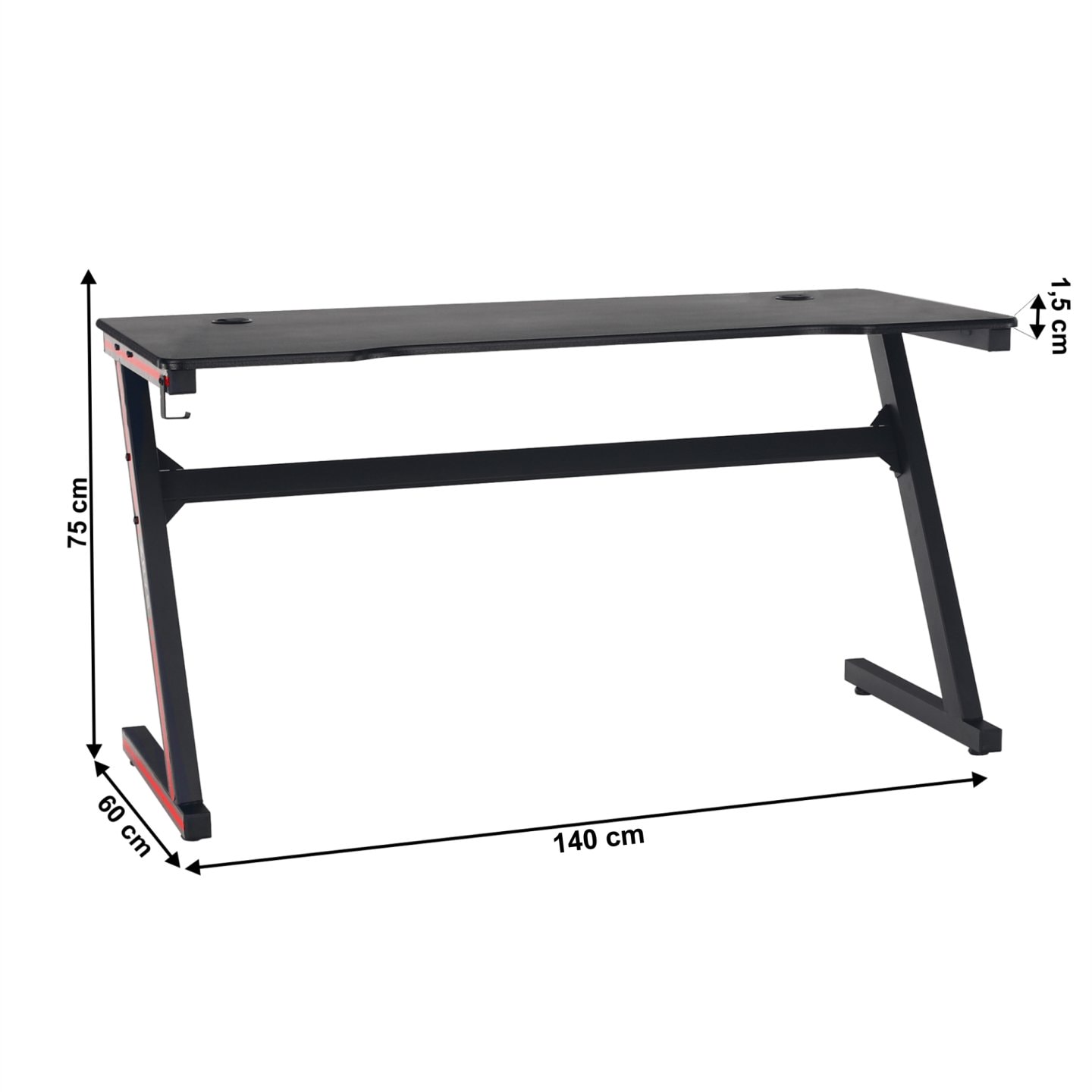Materiál deska: MDF + PVC fólie Barva: černá Materiál konstrukce: kov Barva: práškový nátěr černá + červené nálepky Rozměry (ŠxHxV): 140x60x75 cm Tloušťka plátu stolu: 1,5 cm Statická nosnost: 80 kg univerzální využití herní stůl PC stůl Vysoce kvalitní materiály s dlouhou životností Deska…