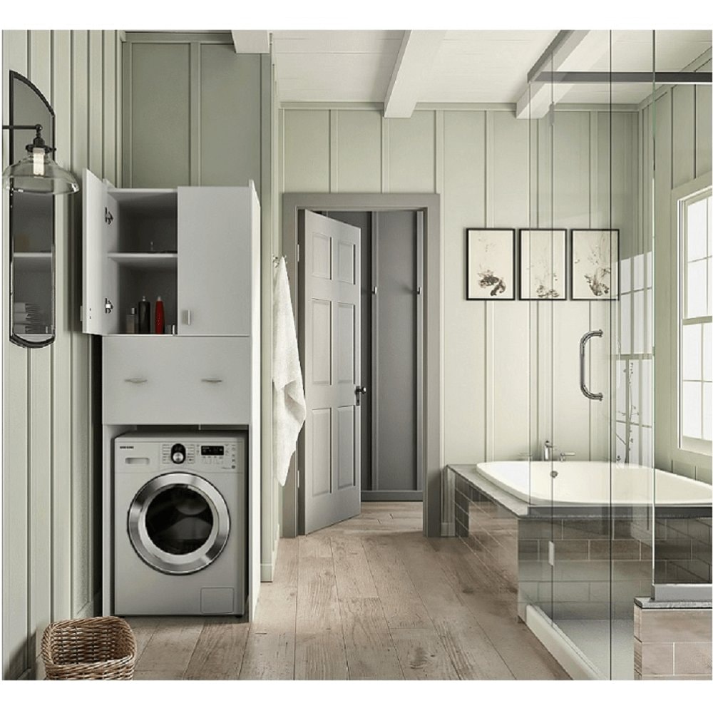 Je perfektním řešením do menších interiérů, protože šetří místo , a zároveň poskytne odkládací plochu navíc. Nabízí uzavřený úložný prostor a to v podobě šuplíku a skříňky s poličkami. Vnitřek skříně je policí rozdělen na dvě odkládací plochy. Je vyrobena z laminované dřevotřísky v bílém barevném provedení. Je možné umístit pod ni pračku s maximálními rozměry 60,8x85,2 cm.