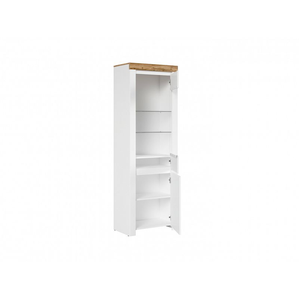 Vitrína je vyrobená v barevném provedení bílá/dub wotan/bílý lesk.