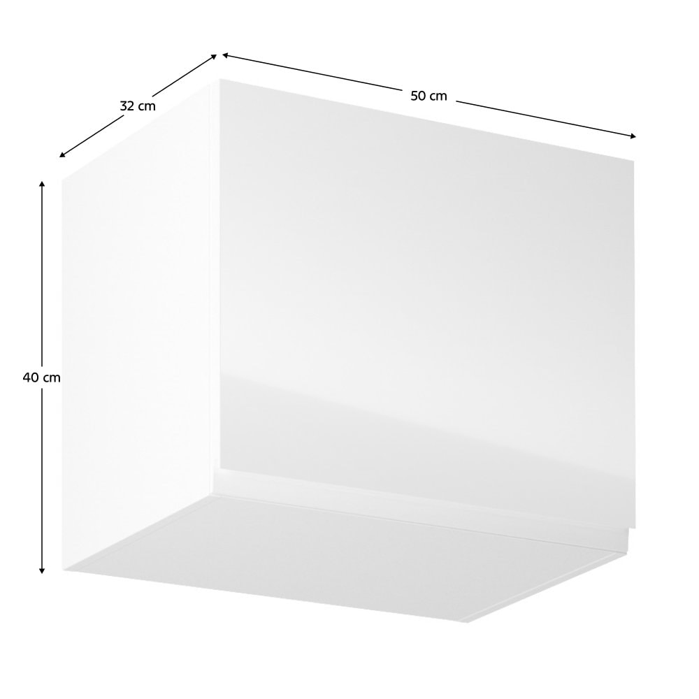 Horní skříňka, Aurora G50K Provedení: DTD laminové / MDF Barva: bílá / bílá lakovaná extra vysoký lesk Rozměry (ŠxHxV): 50x32x40 cm Tloušťka materiálu: 15 mm Systém tichého zavírání dvířek Pracovní deska není součástí skříněk. Je možné si doobjednat pracovní desku v provedení dub artisan tloušťky…
