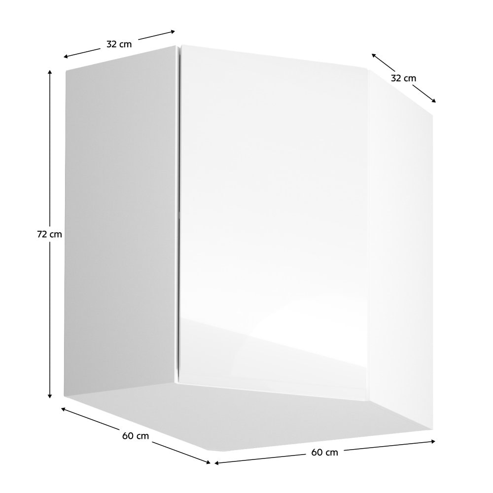 Nabízíme horní rohovou skříňku Aurora G60N. Horní rohová skříňka je s dvířky. Dvířka jsou bez úchytky a otevírají se do pravé strany. Uvnitř najdete jednu polici.