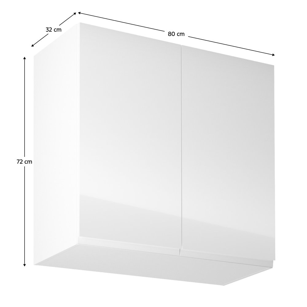 Horní skříňka, Aurora G80 Provedení: DTD laminové / MDF Barva: bílá / bílá lakovaná extra vysoký lesk Rozměry (ŠxHxV): 80x32x72 cm Tloušťka materiálu: 15 mm Systém tichého zavírání dvířek Pracovní deska není součástí skříněk. Je možné si doobjednat pracovní desku v provedení dub artisan tloušťky 38…