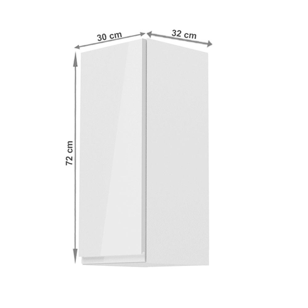 Horní skříňka, Aurora G30, levá Provedení: DTD laminové / MDF Barva: bílá / bílá lakovaná extra vysoký lesk Rozměry (ŠxHxV): 30x32x72 cm Tloušťka materiálu: 15 mm Systém tichého zavírání dvířek Pracovní deska není součástí skříněk. Je možné si doobjednat pracovní desku v provedení dub artisan…