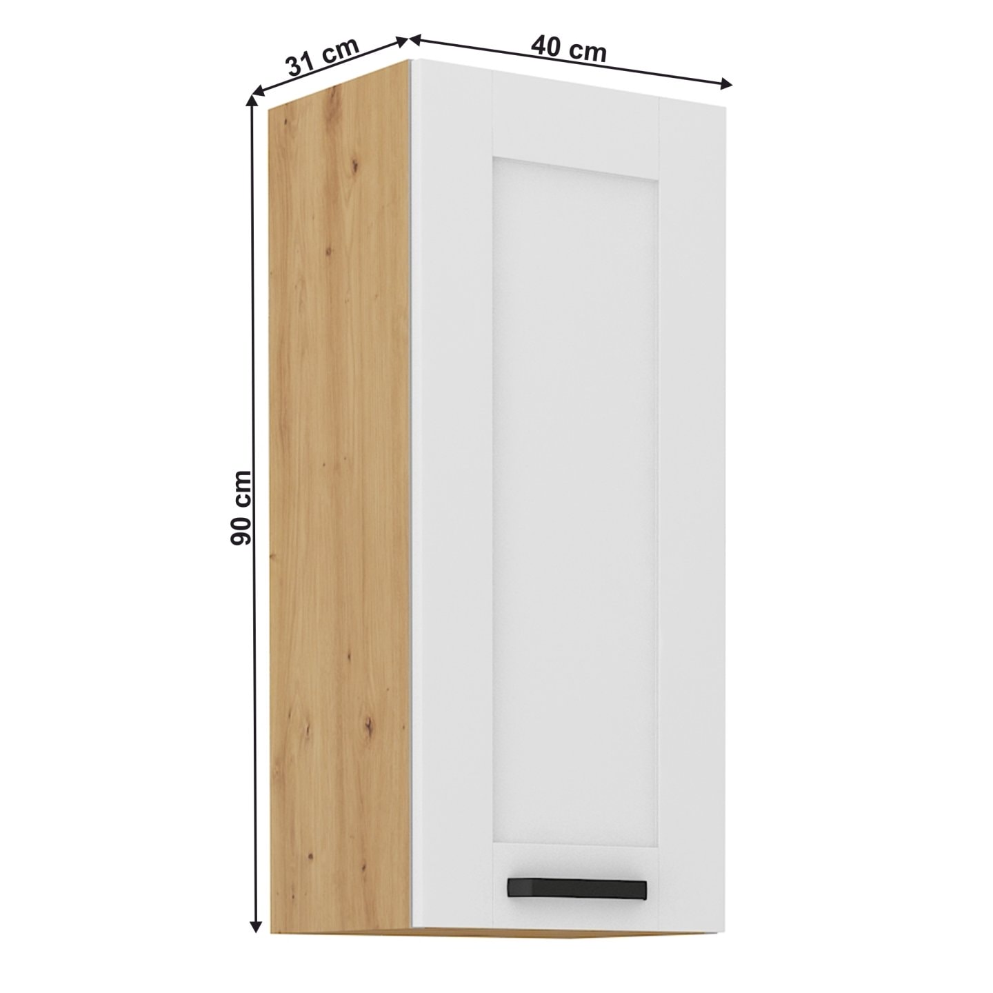 Horní skříňka LULA 40 G-90 1F Materiál: laminovaná DTD/MDF Barva: bílá/dub artisan Rozměry (ŠxHxV): 40x31x90 cm Tloušťka materiálu: 1,6 cm Tloušťka dvířek: 2 cm S policí S kovovou úchytkou Barva úchytky: černá Moderní dynamický design Dodáváno v demontu Možnost dokoupit univerzální dřez LAY ON …