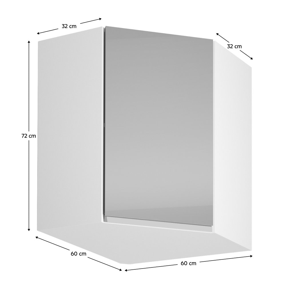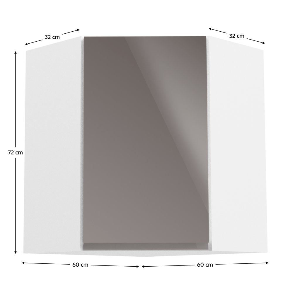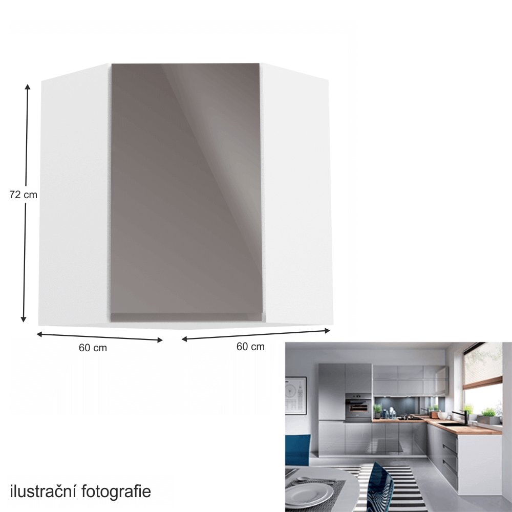 Nabízíme horní rohovou skříňku Aurora G60N. Horní rohová skříňka je s dvířky. Dvířka jsou bez úchytky a otevírají se do pravé strany. Uvnitř najdete jednu polici.