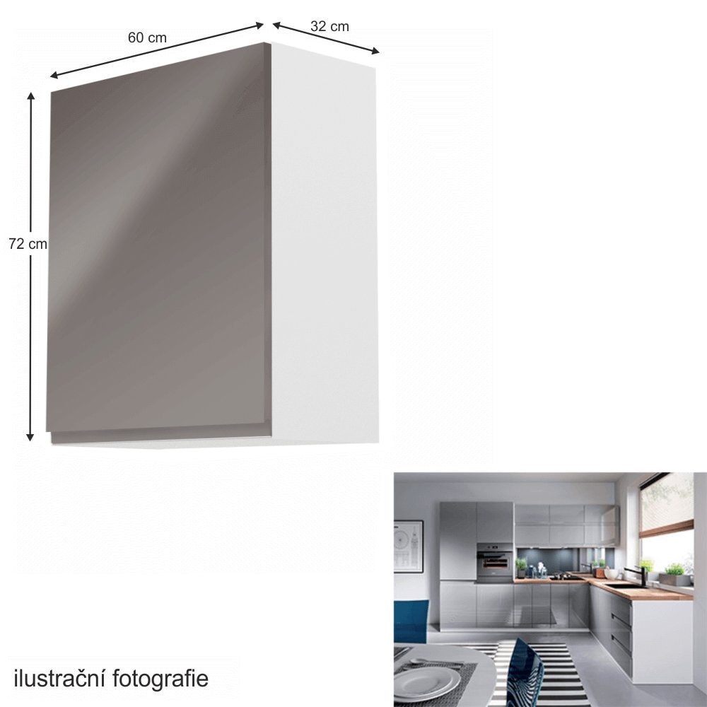 Horní skříňka, Aurora G601F Provedení: DTD laminovaná / MDF Barva: bílá / šedá lakovaná extra vysoký lesk Rozměry (ŠxHxV): 60x32x72 cm Tloušťka materiálu: 15 mm Systém tichého zavírání dvířek Pracovní deska není součástí skříněk. Je možné si doobjednat pracovní desku v provedení dub artisan…