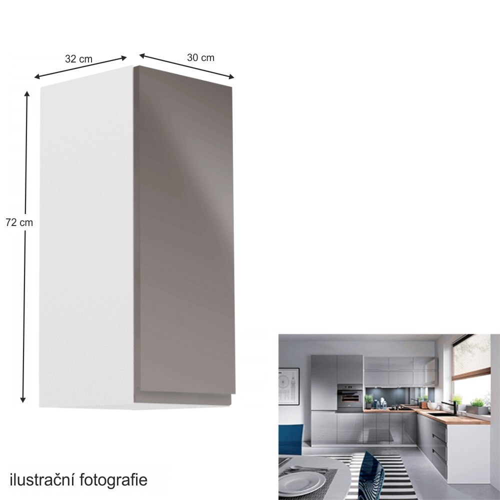 Horní skříňka, Aurora G30 Provedení: DTD laminovaná / MDF Barva: bílá / šedá lakovaná extra vysoký lesk Rozměry (ŠxHxV): 30x32x72 cm Tloušťka materiálu: 15 mm Systém tichého zavírání dvířek Pracovní deska není součástí skříněk. Je možné si doobjednat pracovní desku v provedení dub artisan tloušťky…