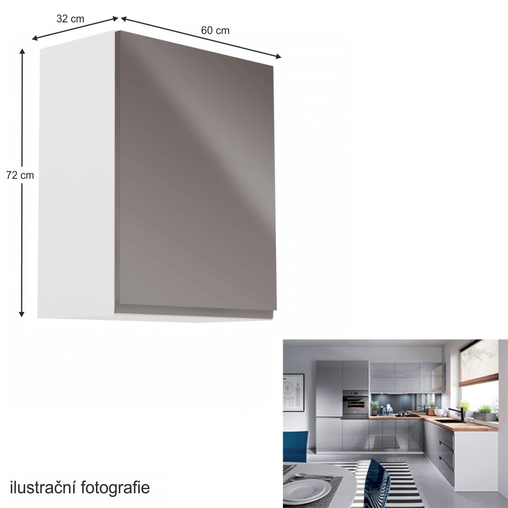 Horní skříňka, Aurora G601F Provedení: DTD laminovaná / MDF Barva: bílá / šedá lakovaná extra vysoký lesk Rozměry (ŠxHxV): 60x32x72 cm Tloušťka materiálu: 15 mm Systém tichého zavírání dvířek Pracovní deska není součástí skříněk. Je možné si doobjednat pracovní desku v provedení dub artisan…