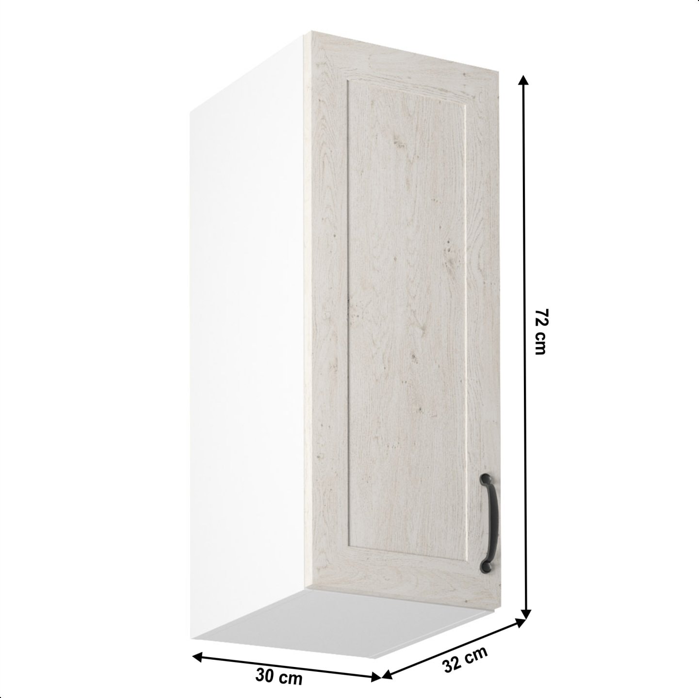 Horní skříňka s dvířky, ROYAL G30, levá Materiál: korpus je vyroben z kvalitní laminované dřevotřísky / kovová úchytka Barva: bílá / dvířka v provedení sosna skandinávská Rozměry ŠxHxV: 30x32x72 cm Tloušťka materiálu: 15 mm Systém tichého zavírání dvířek Dodávané v demontu. Spodní skříňky ke…