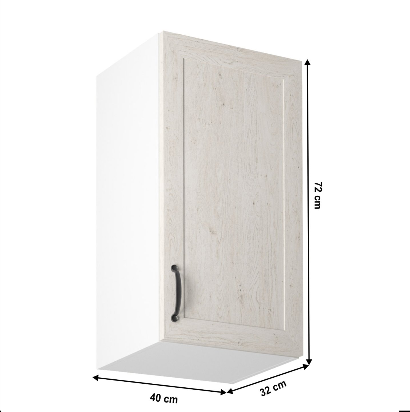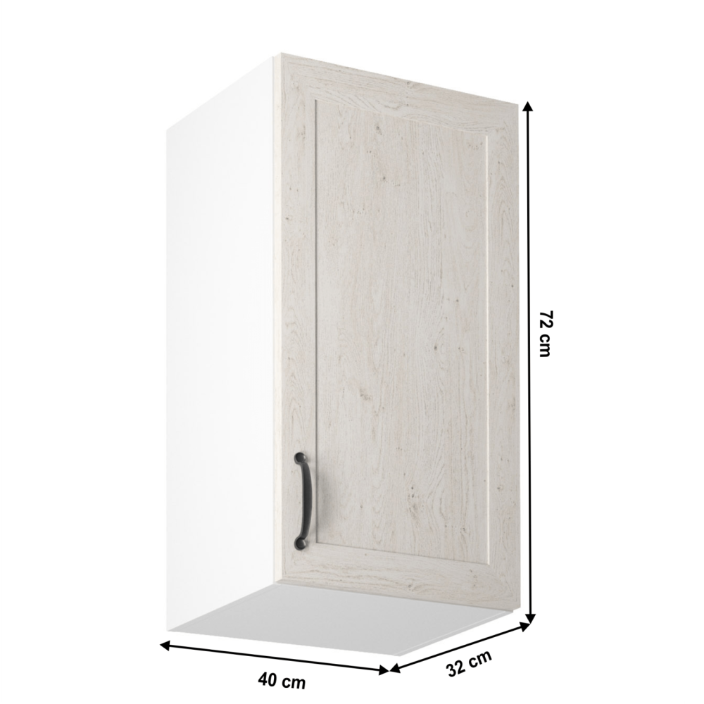 Horní skříňka s dvířky, ROYAL G40, pravá Materiál: korpus je vyroben z kvalitní laminované dřevotřísky / kovová úchytka Barva: bílá / dvířka v provedení sosna skandinávská Rozměry ŠxHxV: 40x32x72 cm Tloušťka materiálu: 15 mm Systém tichého zavírání dvířek Dodávané v demontu. Spodní skříňky ke…
