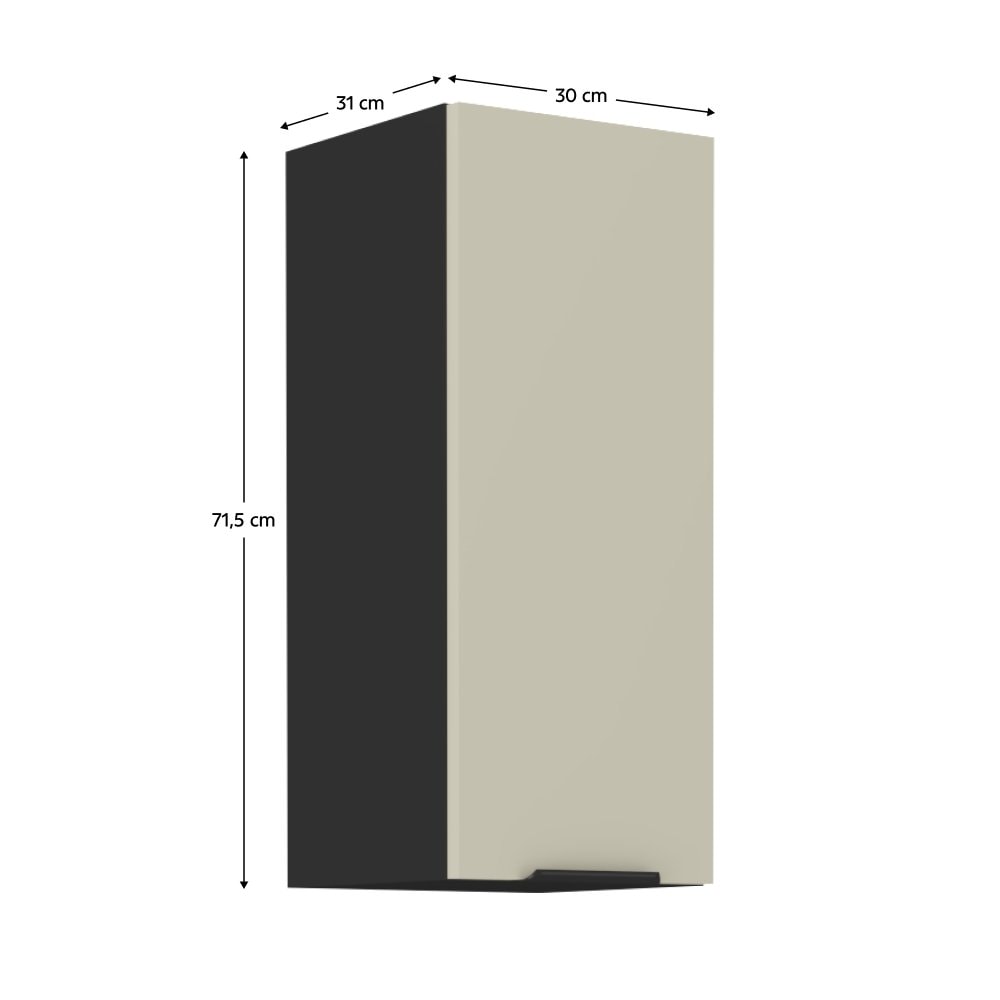 Materiál: laminovaná DTD Barva dvířek: cashmere Barva korpus: černý mat Rozměry (ŠxHxV): 30x31x71,5 cm Tloušťka materiálu: 1,6 cm 1 dvířka S úchytkou Barva úchytky: aluminiová Systém tichého zavírání dvířek Moderní design Dodáváno v demontu Spodní sektorové skříňky jsou dodávány včetně dolní lišty…
