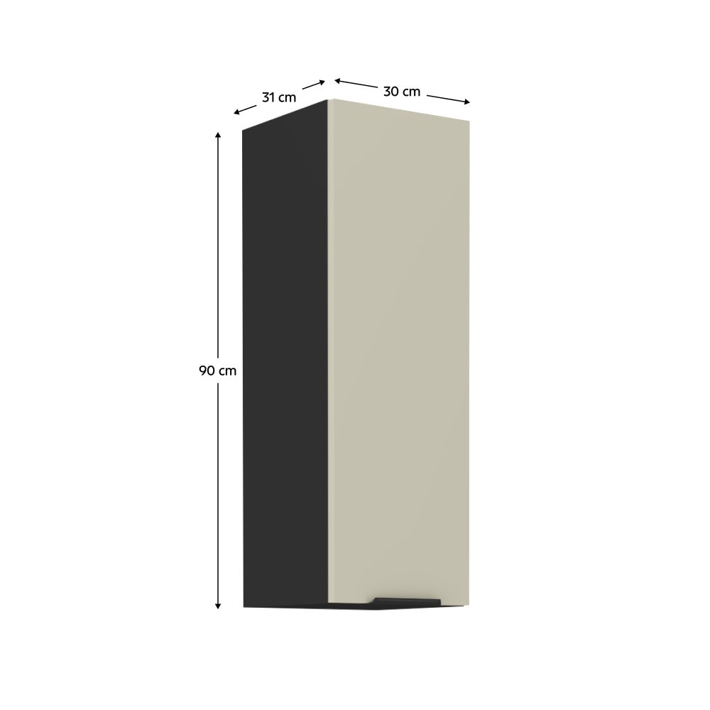 Materiál: laminovaná DTD Barva dvířek: cashmere Barva korpus: černý mat Rozměry (ŠxHxV): 30x31x90 cm Tloušťka materiálu: 1,6 cm 1 dvířka S úchytkou Barva úchytky: aluminiová Systém tichého zavírání dvířek Moderní design Dodáváno v demontu Spodní sektorové skříňky jsou dodávány včetně dolní lišty …