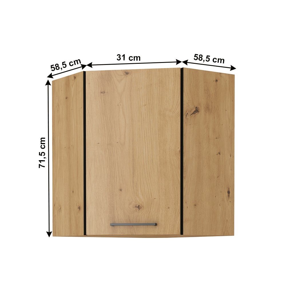 Horní rohová skříňka Monrovia 60/60 GN-72 1F je s dvířky. Celá skříňka je v provedení dub artisan. Vnitřek skříňky je bílý. Dvířka se otevírají pomocí úchytky. Vyniká také tichým dorazem dvířek.