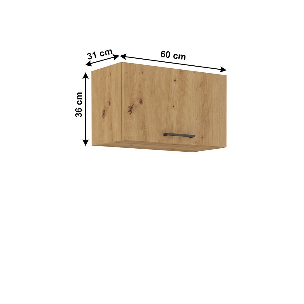 Horní skříňka Monrovia 60 GU-36 1F je s dvířky. Celá skříňka je v provedení dub artisan. Vnitřek skříně je bílý. Dvířka se otevírají pomocí úchytky. Vyniká také tichým dorazem dvířek.