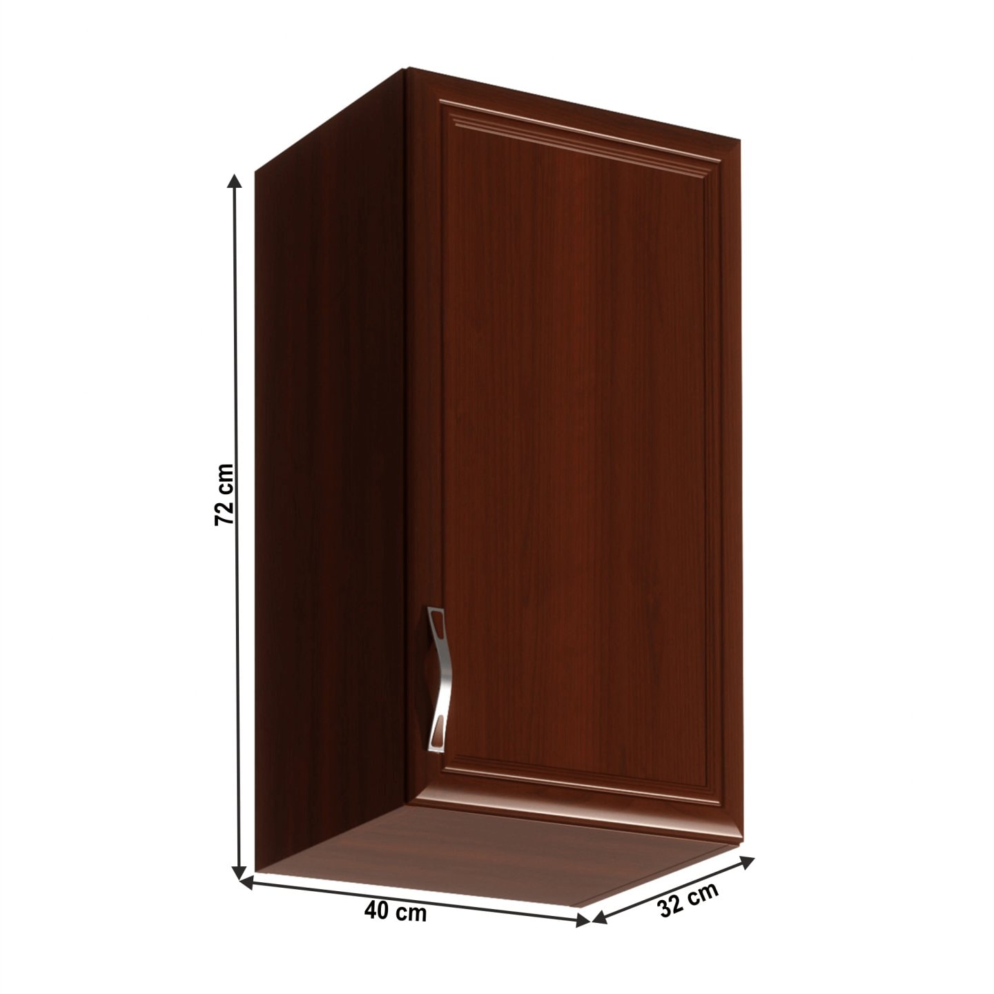 Horní skříňka G40 pravá ke kuchyni SICILIA Provedení: DTD laminovaná / lišty MDF Barva: ořech Milano Rozměry (ŠxHxV): 40x32x72 cm Tloušťka materiálu: 15 mm Spodní skříňky jsou dodávány bez pracovní desky. Můžete si objednat pracovní desku pískovec k provedení ořech Milano - tloušťka 28mm za 1.450…