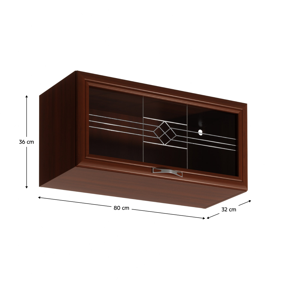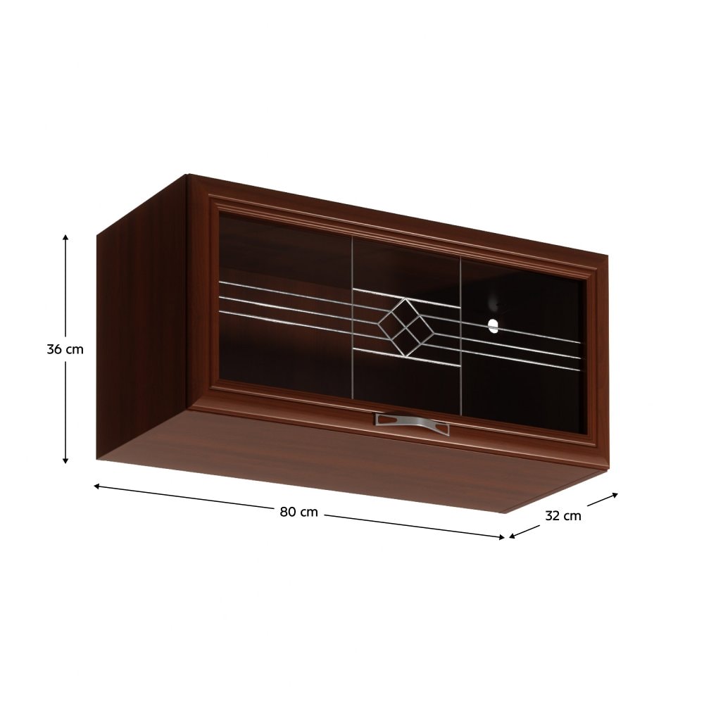 Horní skříňka G80KS je s dvířky se sklem, které se otevírají vyklápěním vzhůru. Dvířka zdobí praktická kovová úchytka. Rustikálně působící lišty jsou z kvalitní MDF. Sklo je průzračné, zdobené jemným ornamentem.