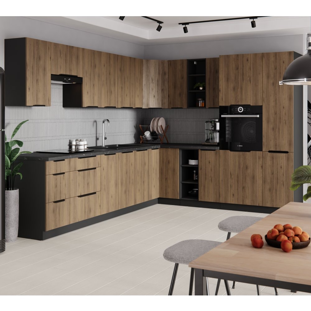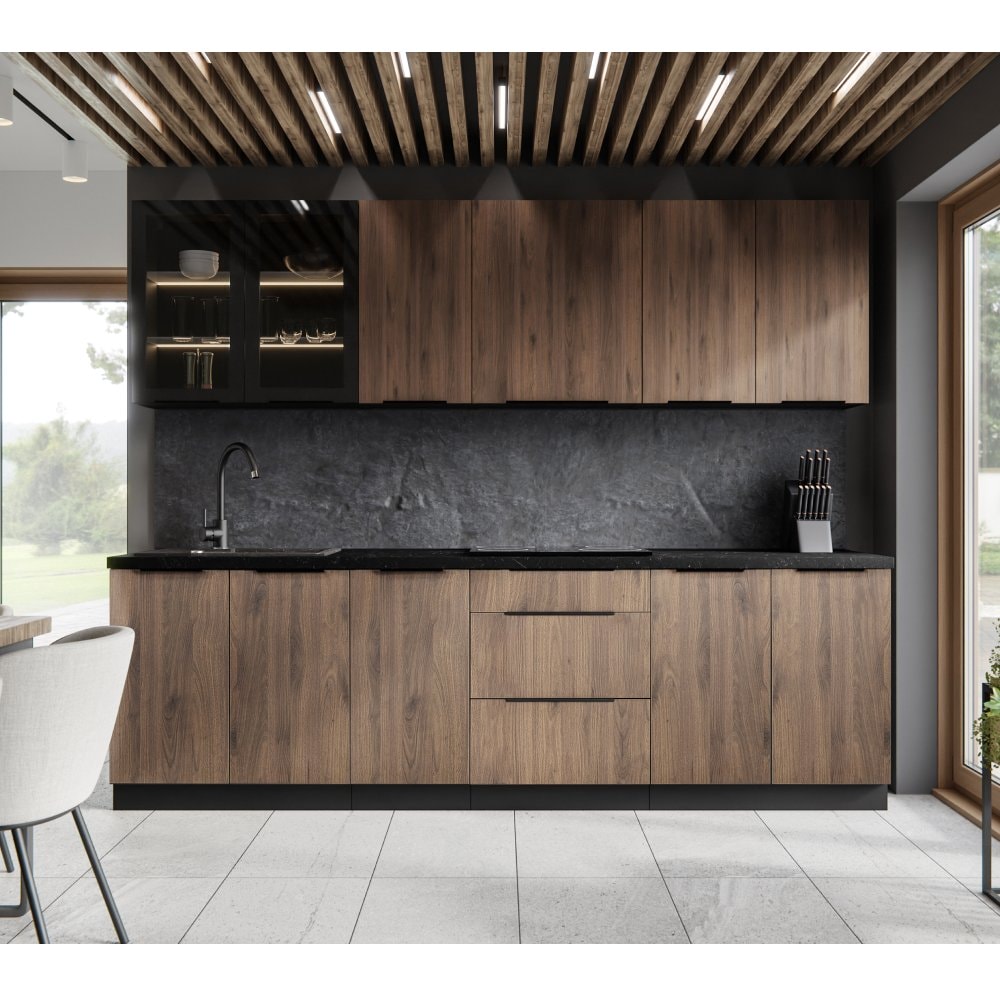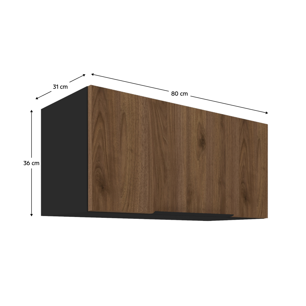 Horní skříňka MENZO 80 GU-36 1F je s dvířky v kombinaci ořech okapi s černou matnou barvou. Dvířka se otevírají pomocí úchytu, vyklopením nahoru.