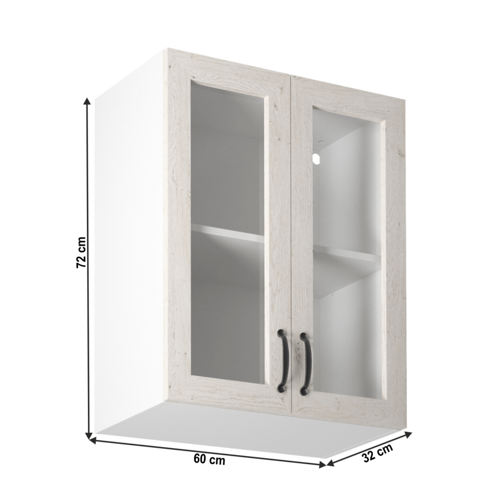 Horní skříňka s dvířky se sklem, ROYAL G60S Materiál: korpus je vyroben z kvalitní laminované dřevotřísky / kovová úchytka/sklo Barva: bílá / dvířka v provedení sosna skandinávská Rozměry ŠxHxV: 60x32x72 cm Tloušťka materiálu: 15 mm Systém tichého zavírání dvířek Dodávané v demontu. Spodní skříňky…