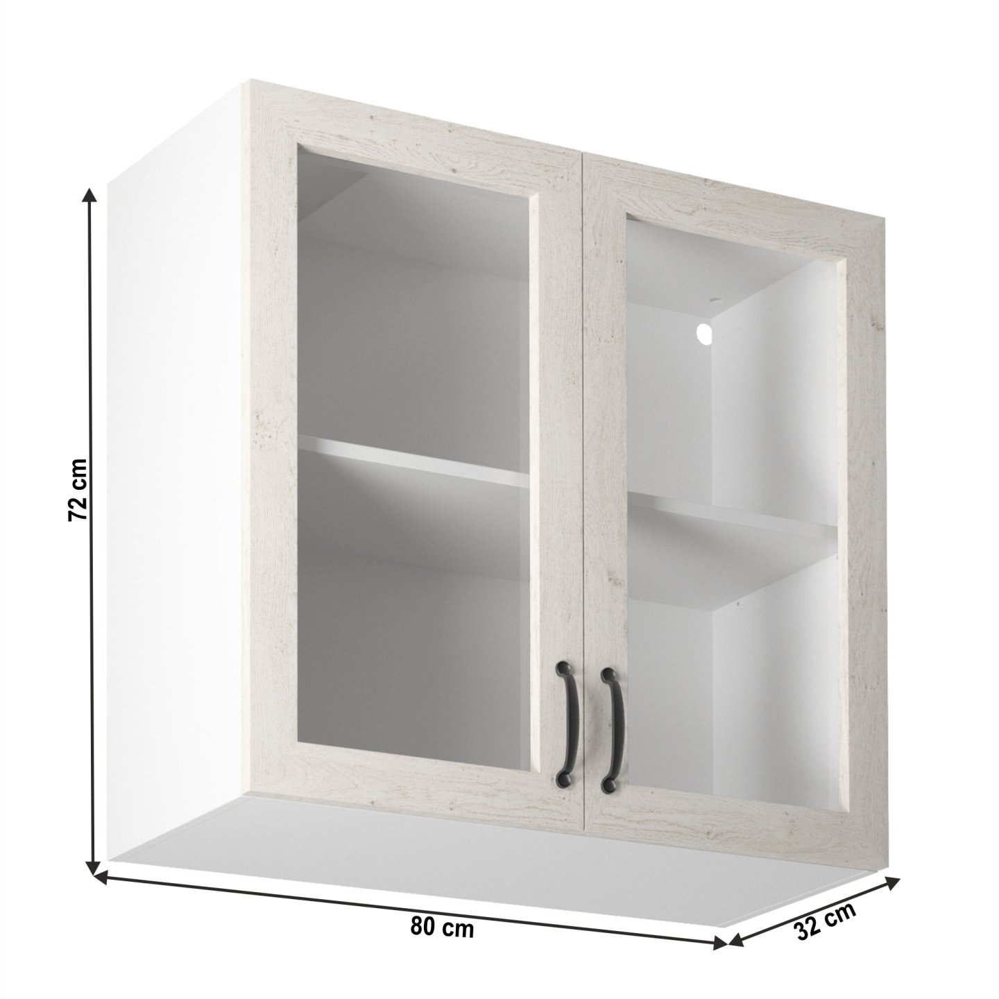 Horní skříňka se sklem s dvířky, ROYAL G80S Materiál: korpus je vyroben z kvalitní laminované dřevotřísky / kovová úchytka/sklo Barva: bílá / dvířka v provedení sosna skandinávská Rozměry ŠxHxV: 80x32x72 cm Tloušťka materiálu: 15 mm Systém tichého zavírání dvířek Dodávané v demontu. Spodní skříňky…
