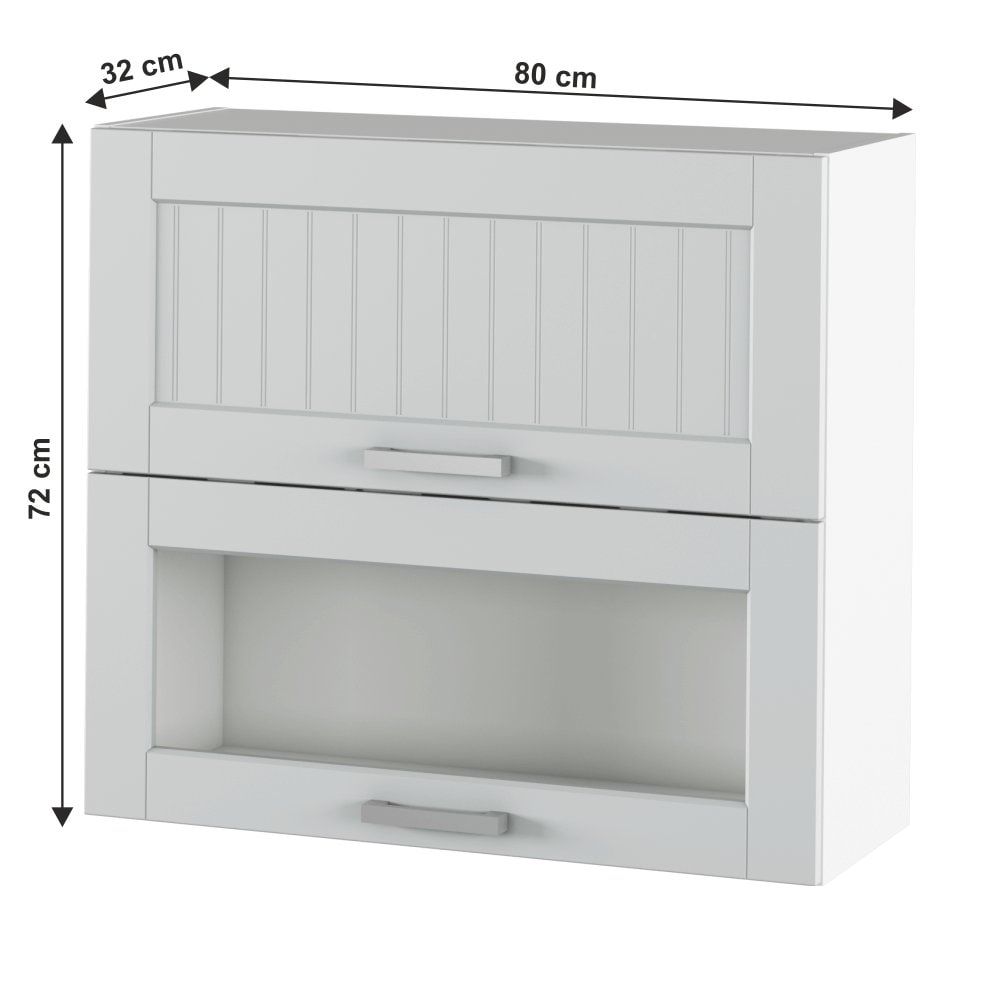 Materiál skříňka: DTD laminovaná / MDF / skloBarva skříňka: světle šedá / bíláMateriál úchytka: kovBarva úchytka: matný chromRozměry (ŠxHxV): 80x32x72 cmTloušťka materiálu: 16 mmVýklopné dvířkaProsklené dvířkaS úchytkouPolicováDodáváno v demontu